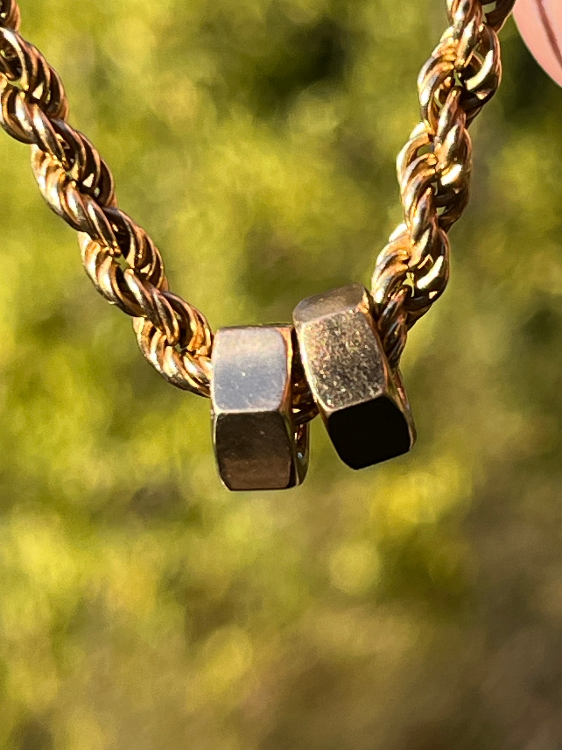 On the left: Approx. 3g. 10mm at the widest, interior opening is approximately 4mm, and 4mm thick.