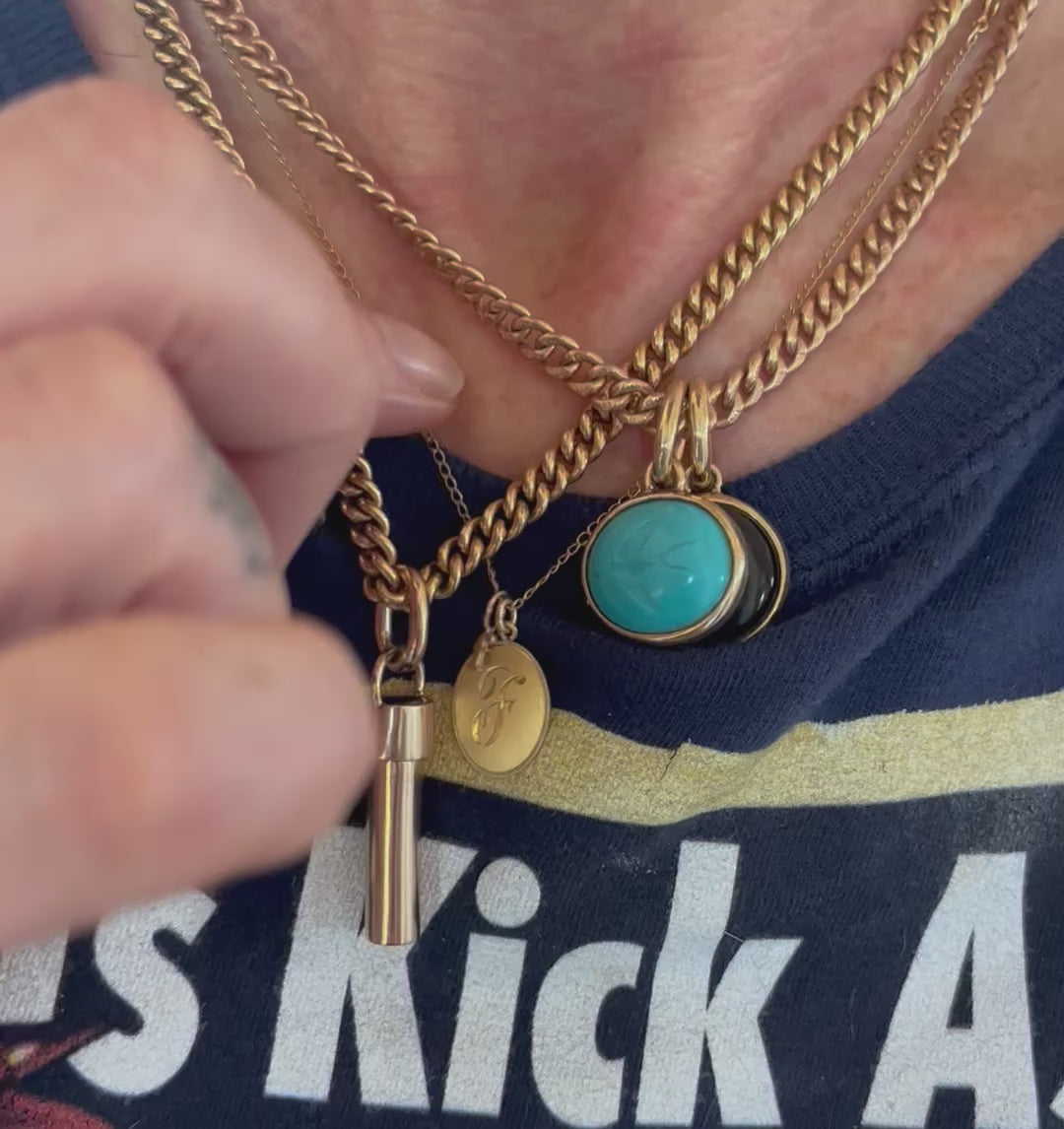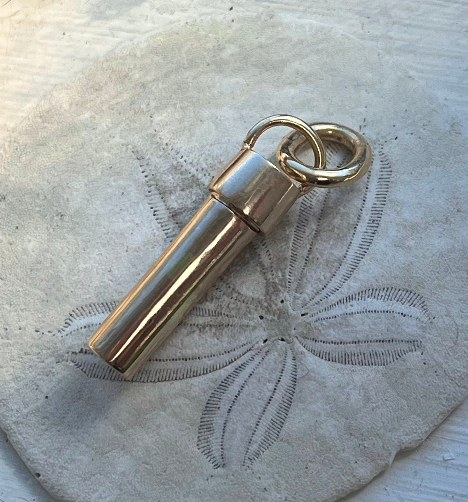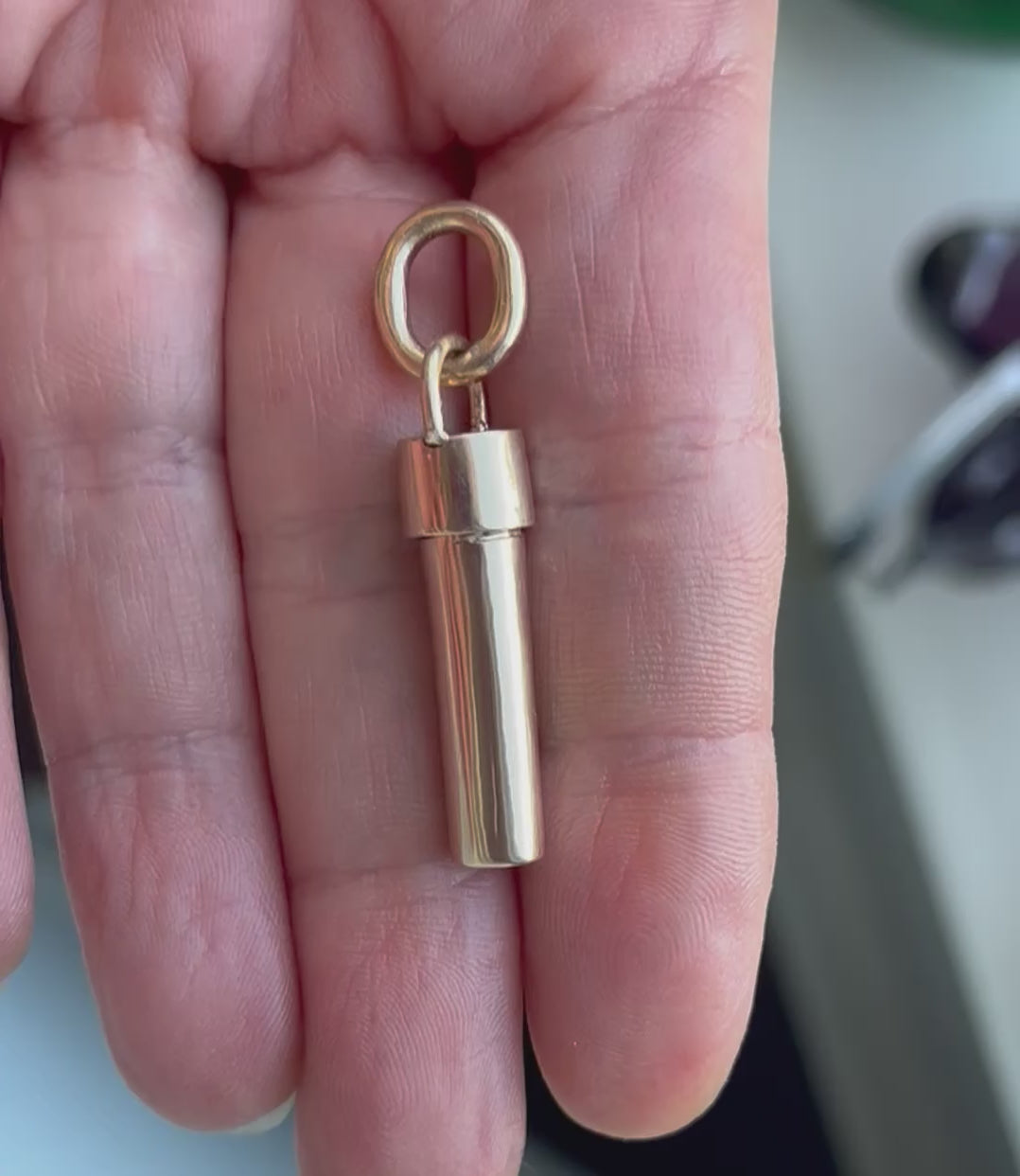 14k with a tiny brilliant cut natural diamond set in both the bottom and the cap, which screws closed. 8g, 32mm high to the top half circle on the cap- the big fat 11mm high ring at the top has a 7 x 5 mm opening. The diameter of the vessel is 4+mm. Food for thought in deciding what you might keep in there. Made to order; please allow 3 weeks to ready to ship.