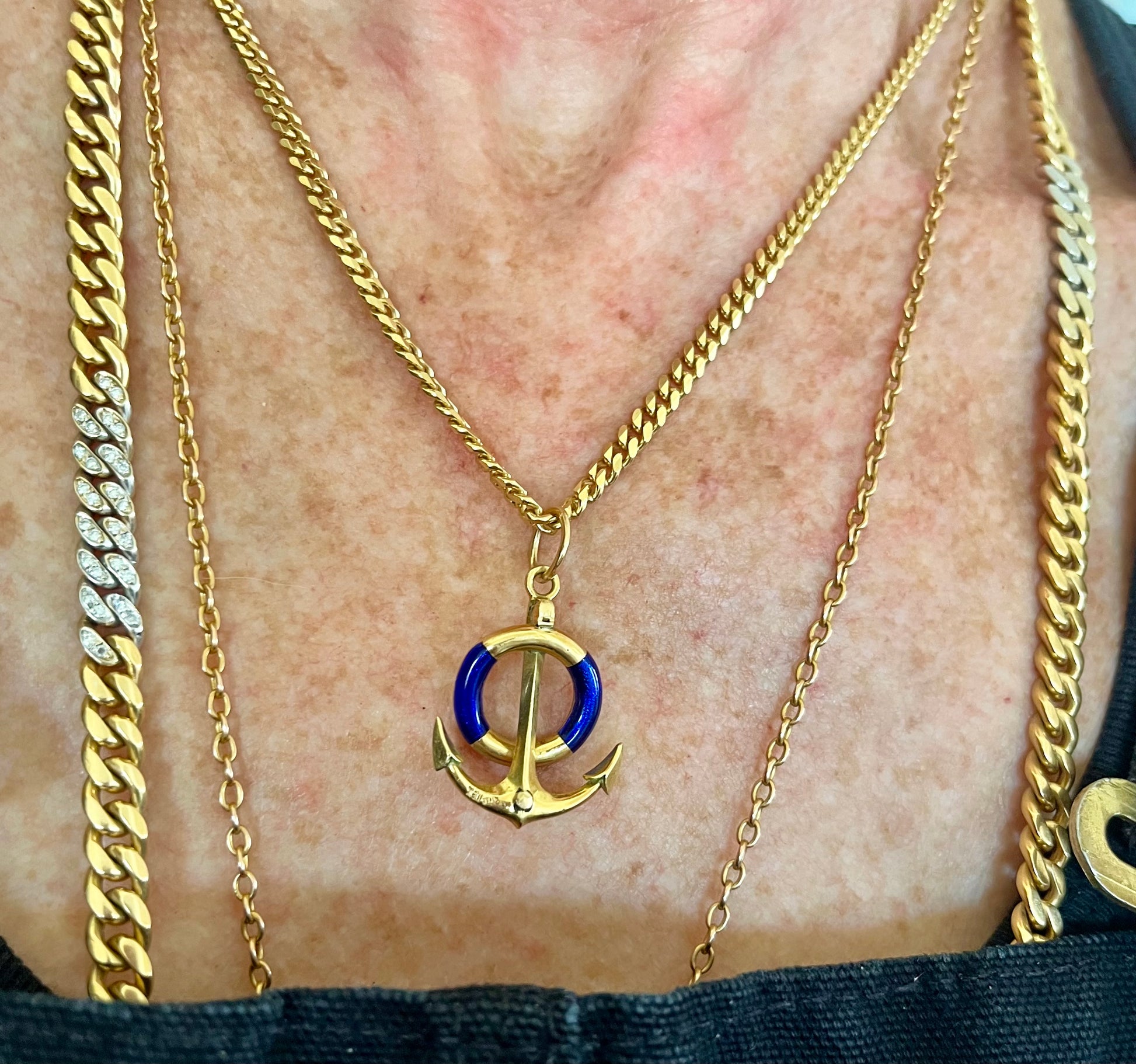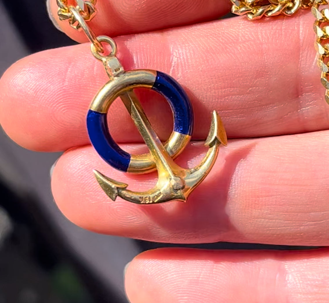 blue enamel and 18k antique brooch conversion. 5g, 1" without bail. May we all feel anchored to what we love.