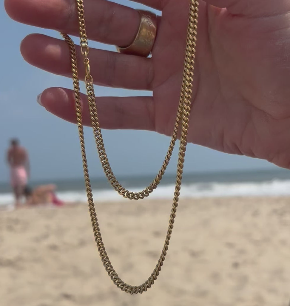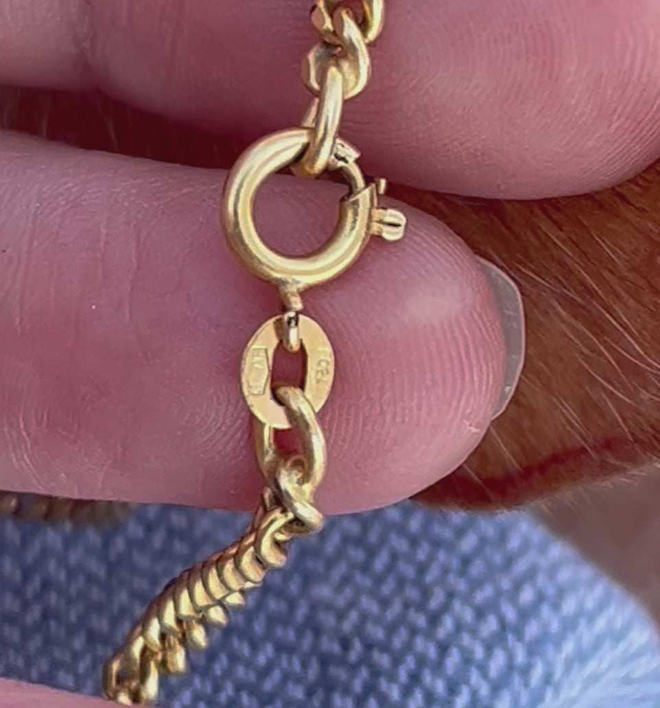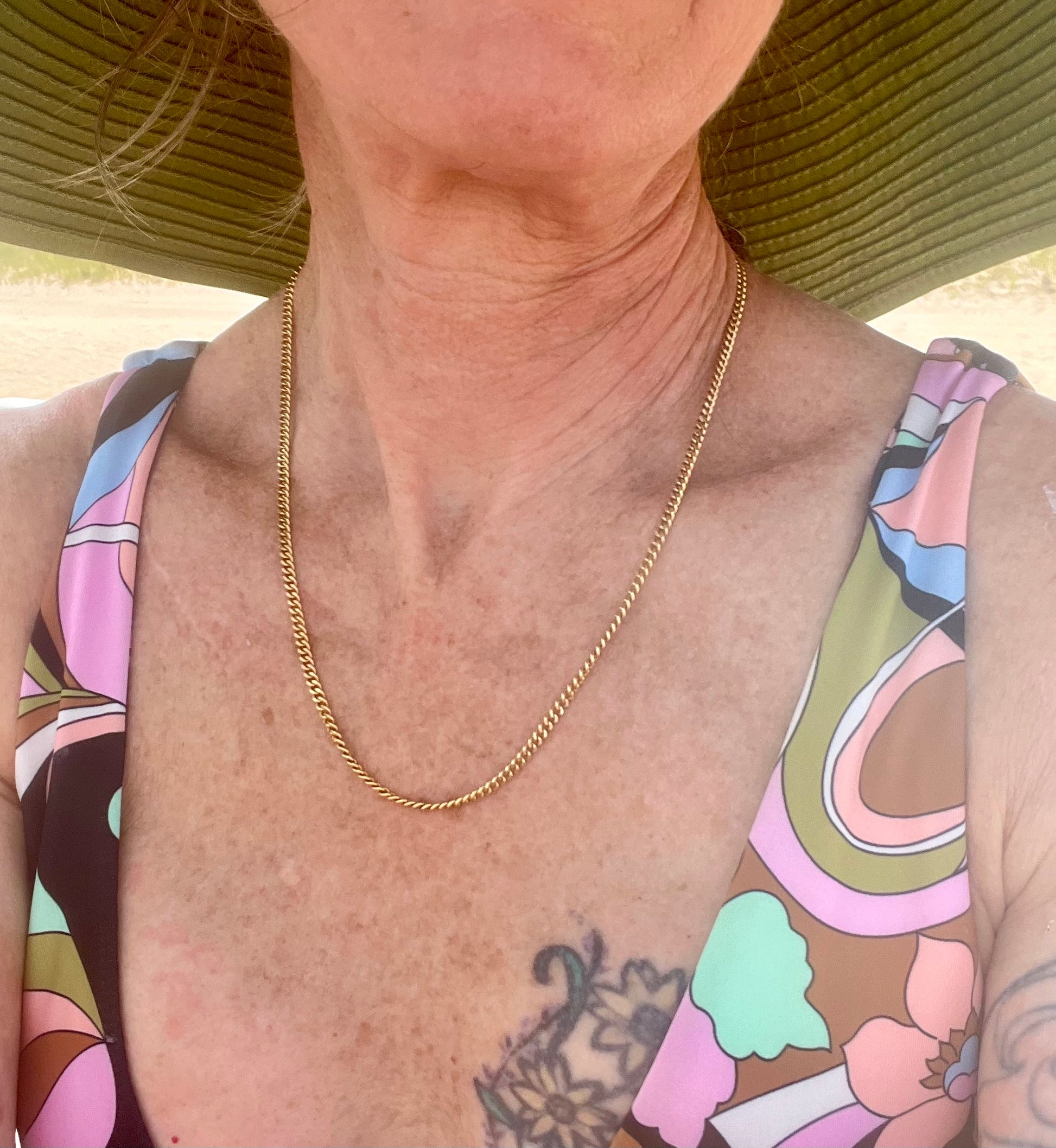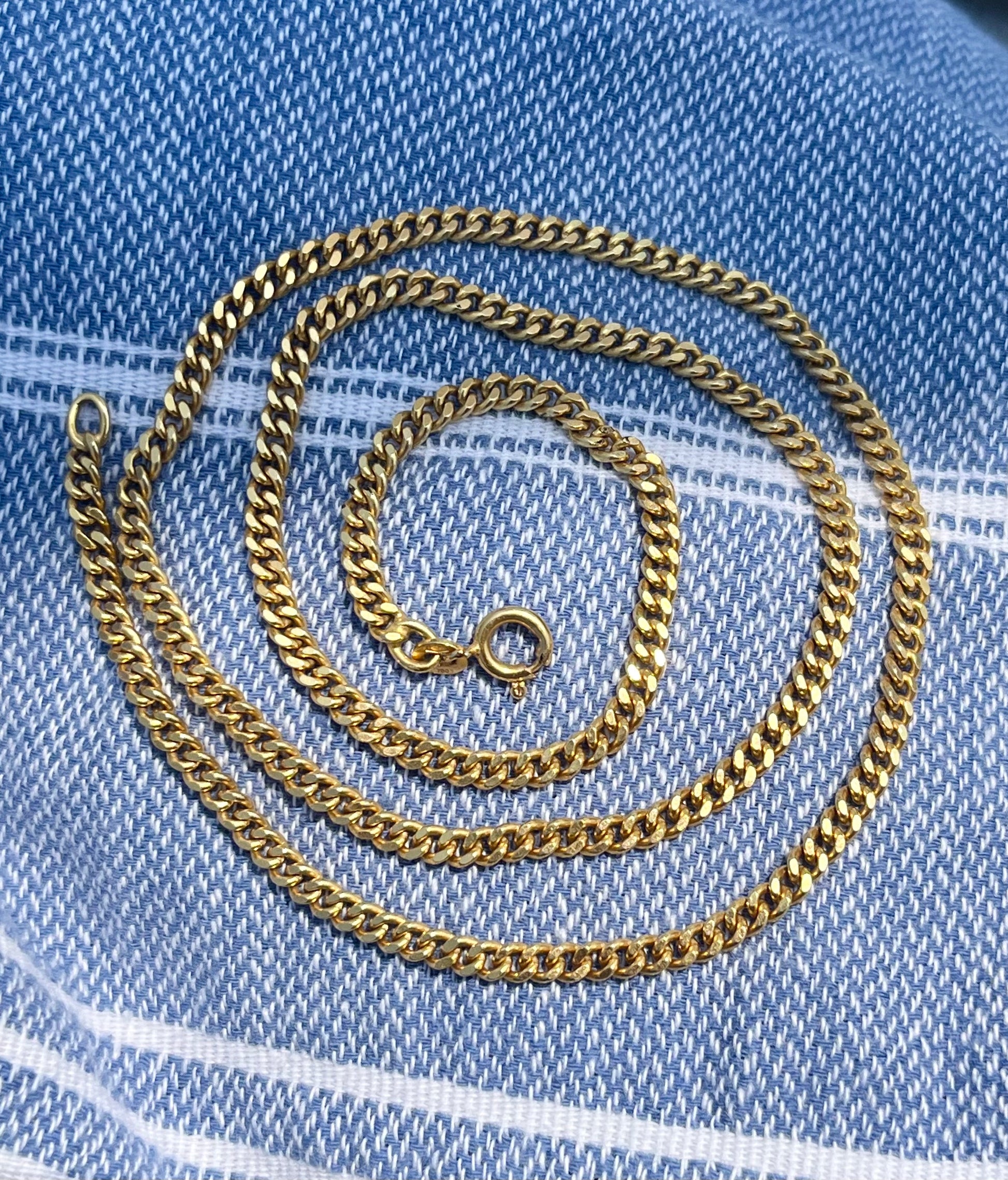 Vintage 18k curb link w a bolt clasp, 21g, 20" long, 3mm wide. Likely Italian, Hallmarked 750, others are challenging to read!