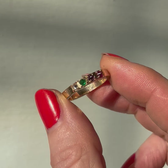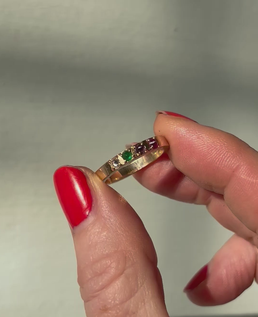 Here we have an igd custom acrostic "DEAR" ring. Diamond, Emerald, Amethyst, Ruby, in a slim 14 K pipe cut ring. 4.4g, Size 7, sizable. Gemstones are reverse set (bottoms up) since that is currently our jam. Shown here with our custom cast OK ring and an IGD custom skull. Please email us if you need it sized so we can price it out for you.