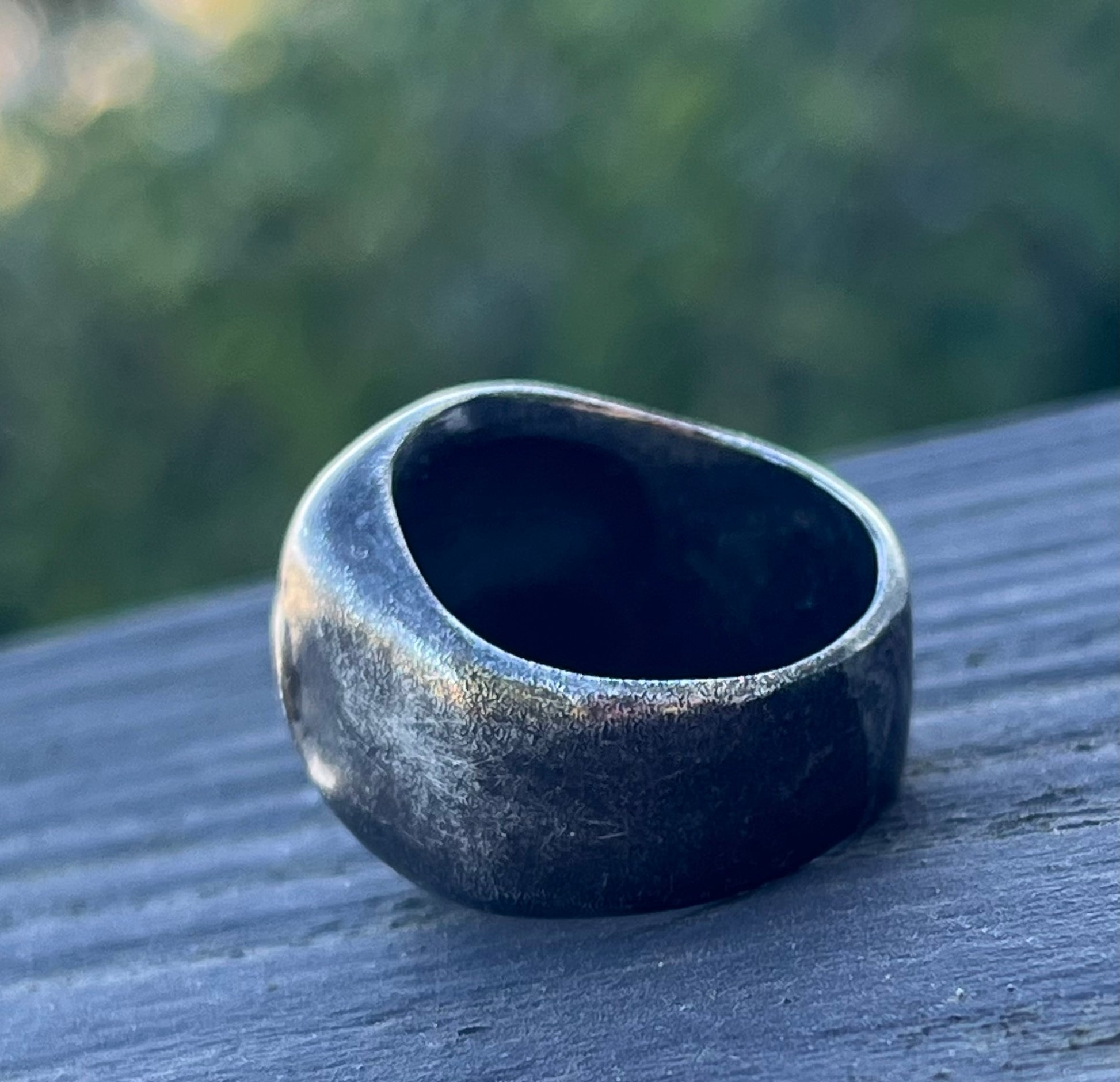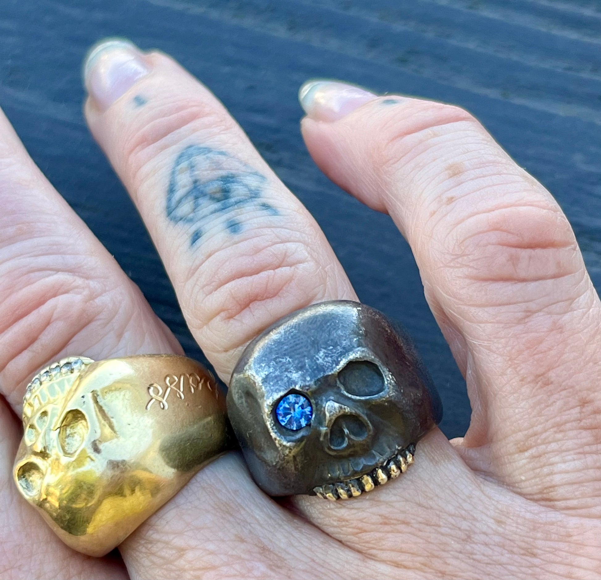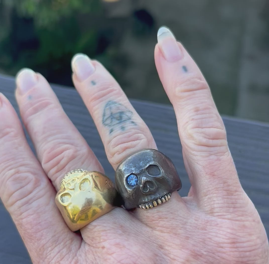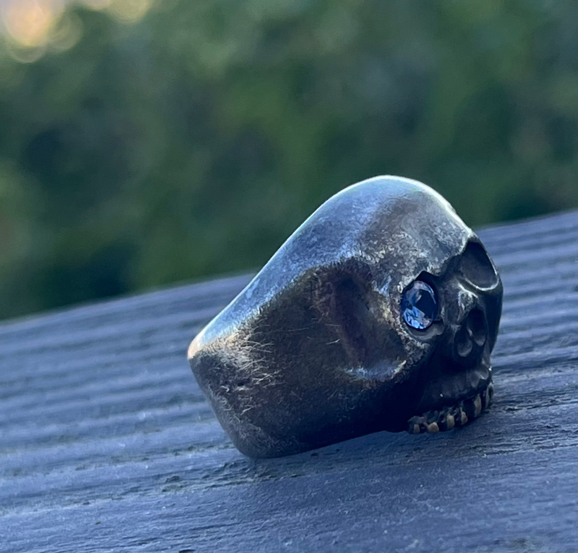 Blackened sterling silver skull with 18 K teeth. One ceylon sapphire eye for good luck. Size 7 and sizable . 18+g. Made to order- allow up to four weeks to completion and please email for other sizes and stone options.