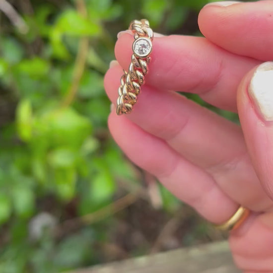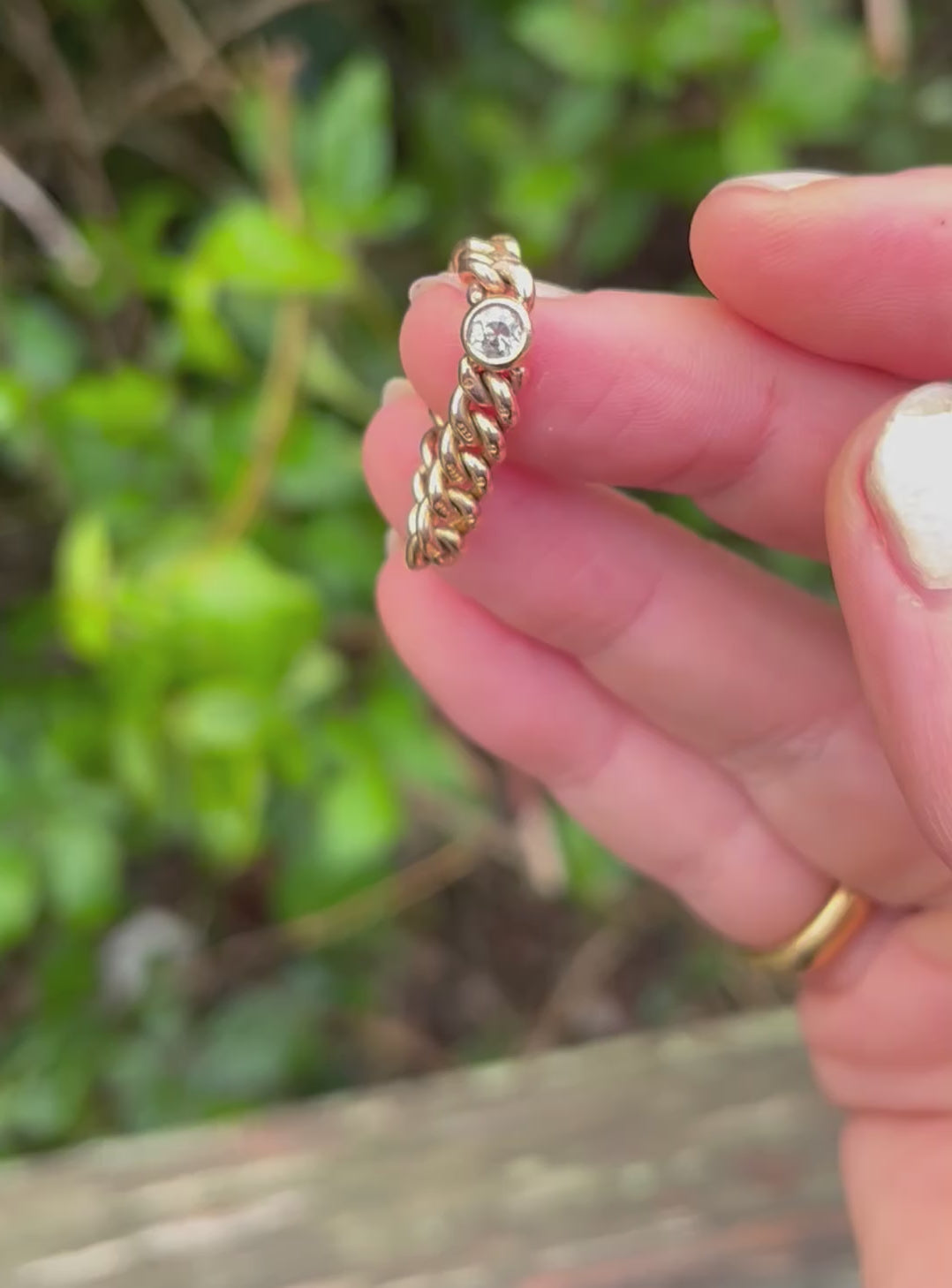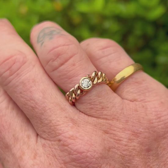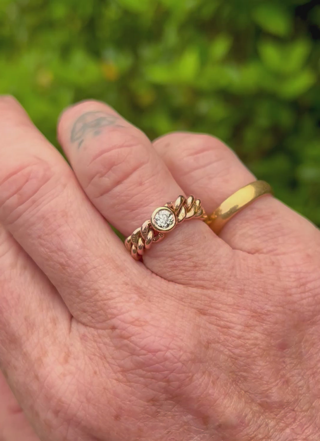 9k antique watchchain- gone- chain ring. We added a 14k bezel and an approx. .35ct old mine cut diamond. Every link is hallmarked, slightly graduated links ranging from 4-5mm wide.