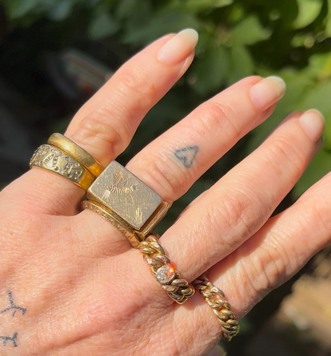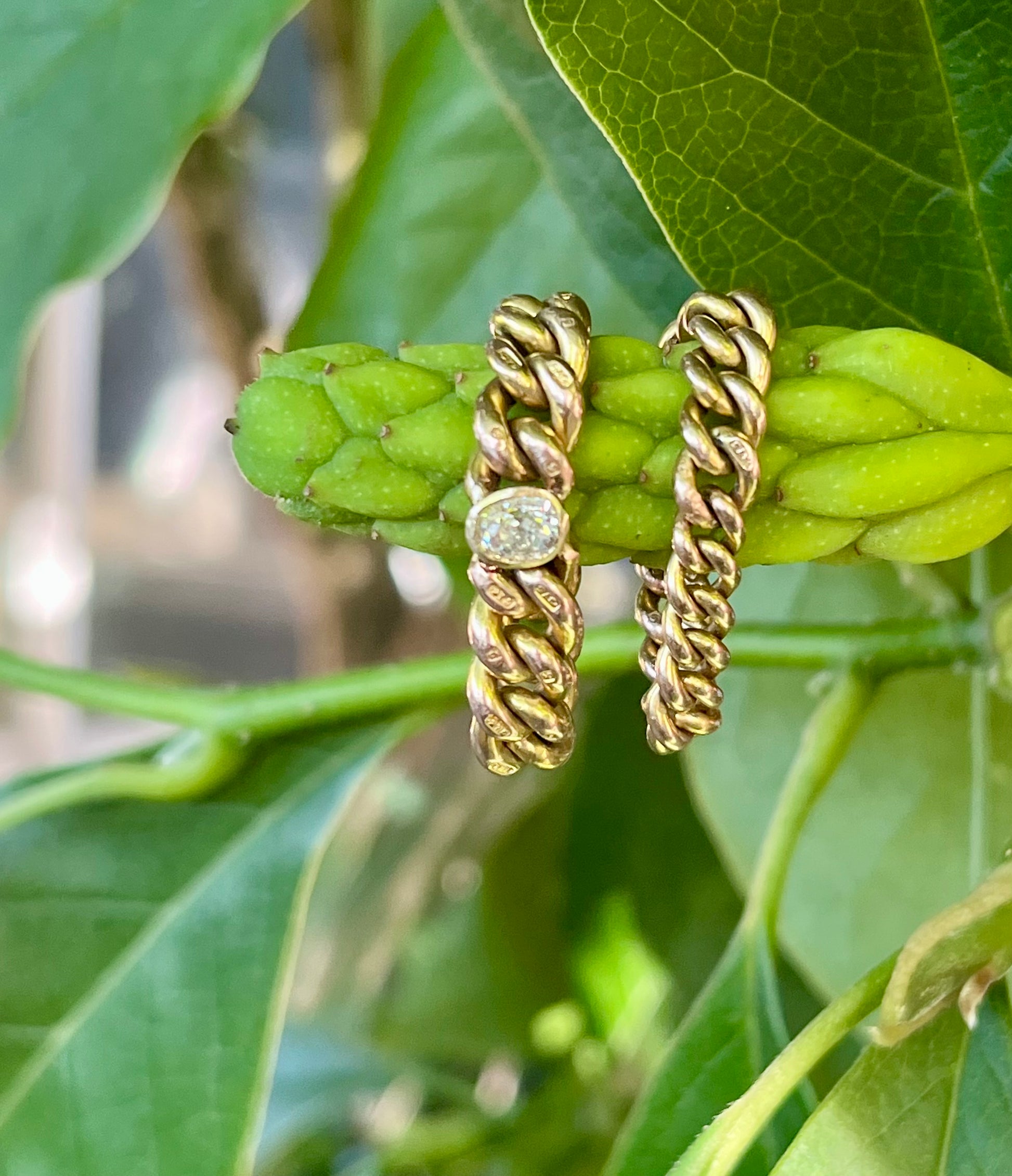 A 9k graduated watch chain with every link hallmarked, transformed to 2 fluid chain rings. Very versatile pieces - incredibly comfortable, great stackers. This listing is for ring #1, set with an OMC diamond.