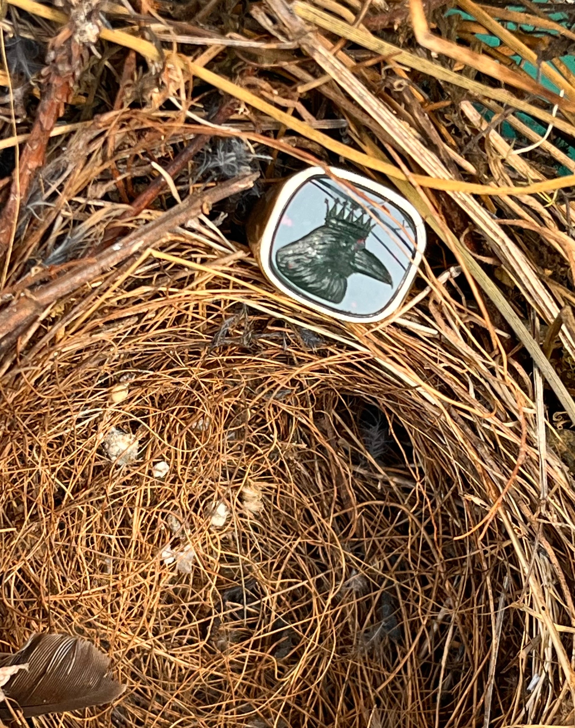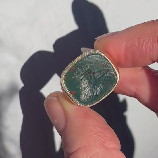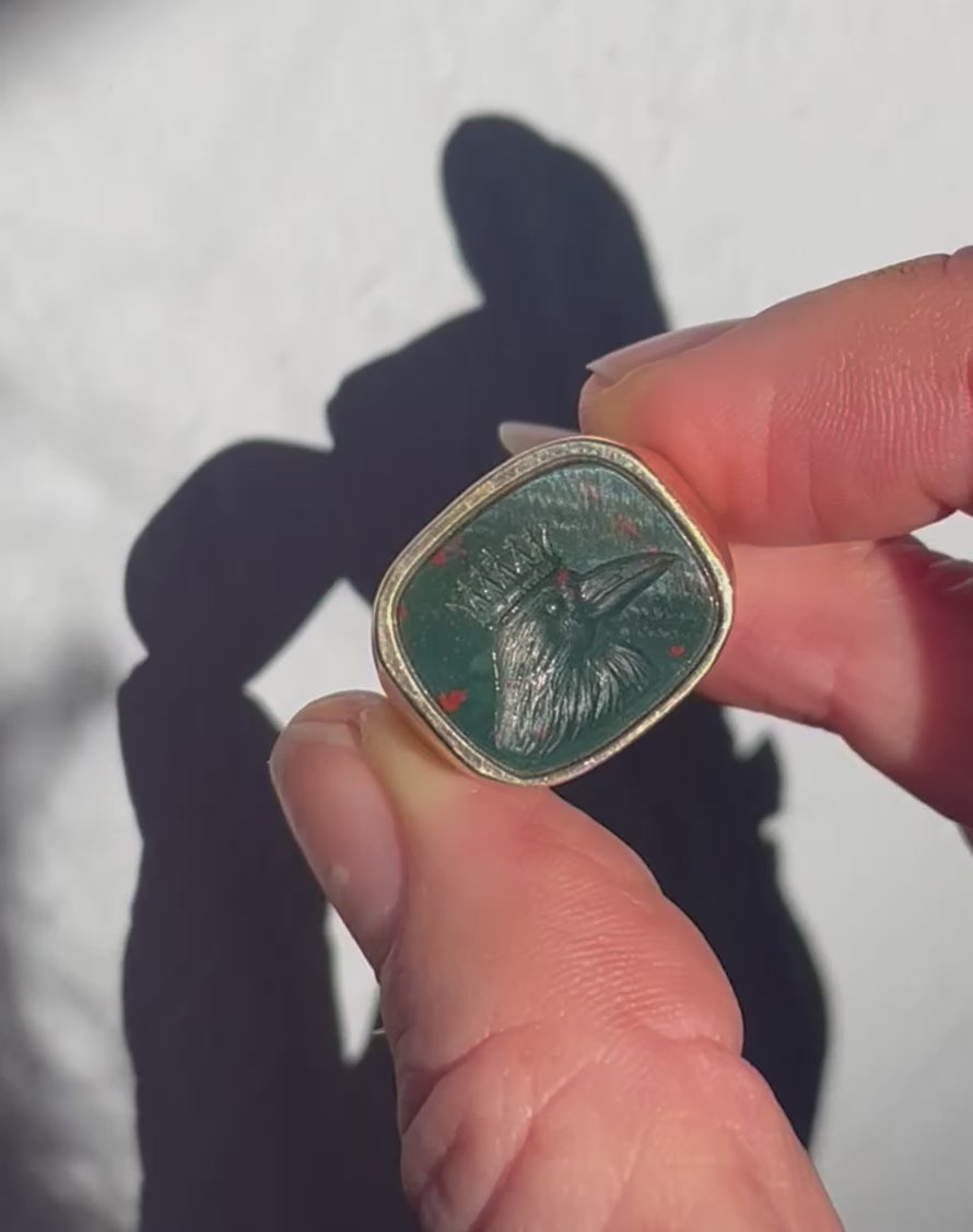 Here is an igdcustom piece - a crowned raven bloodstone intaglio signet, 10.8g, sizable size 6.5. 14k, face is 18 x 16mm. Please email if you need sizing to discuss an additional fee.