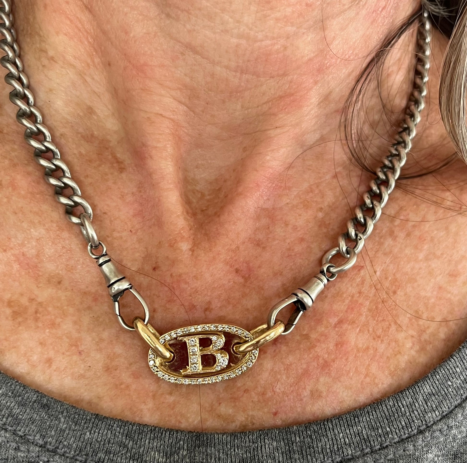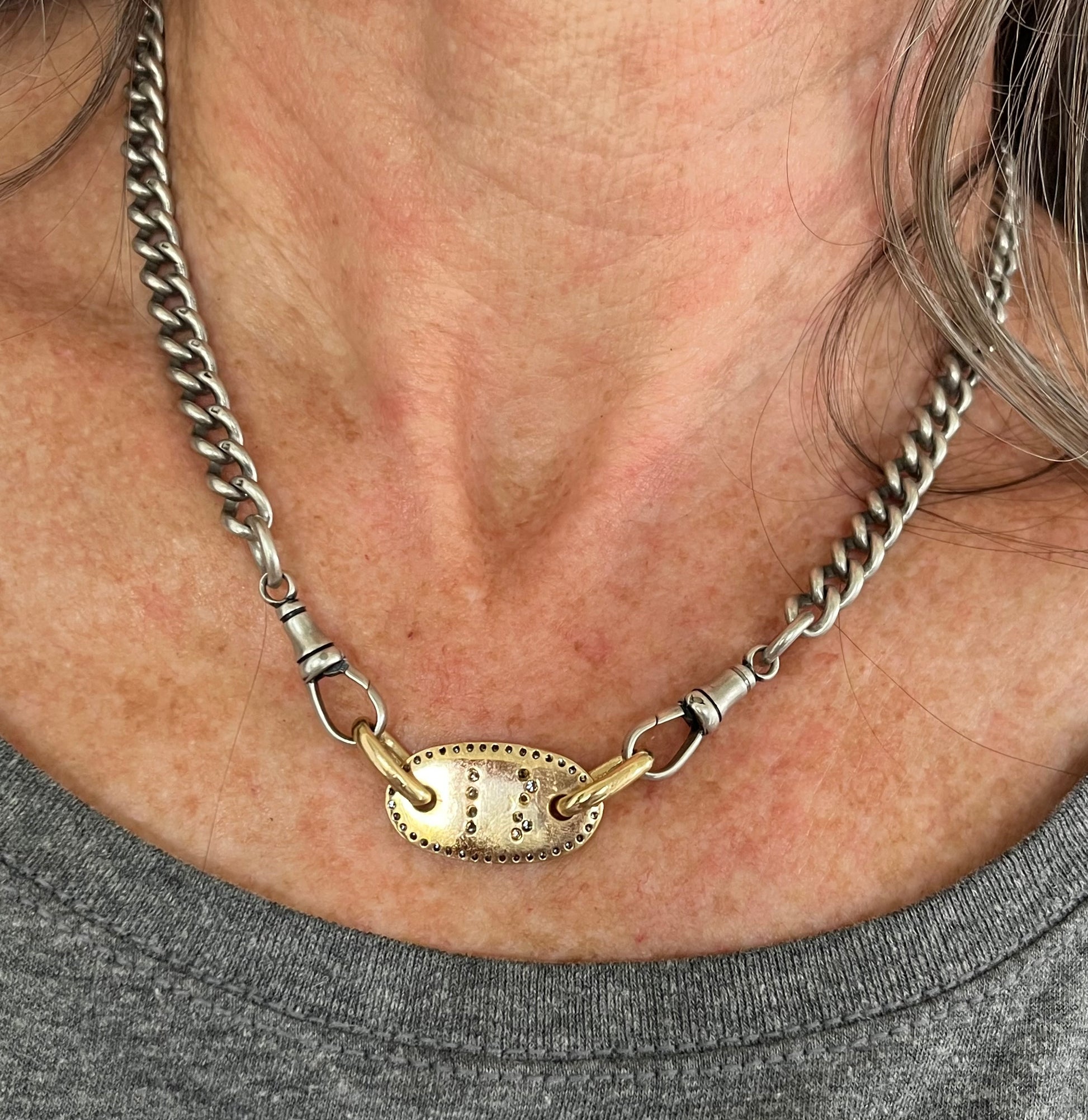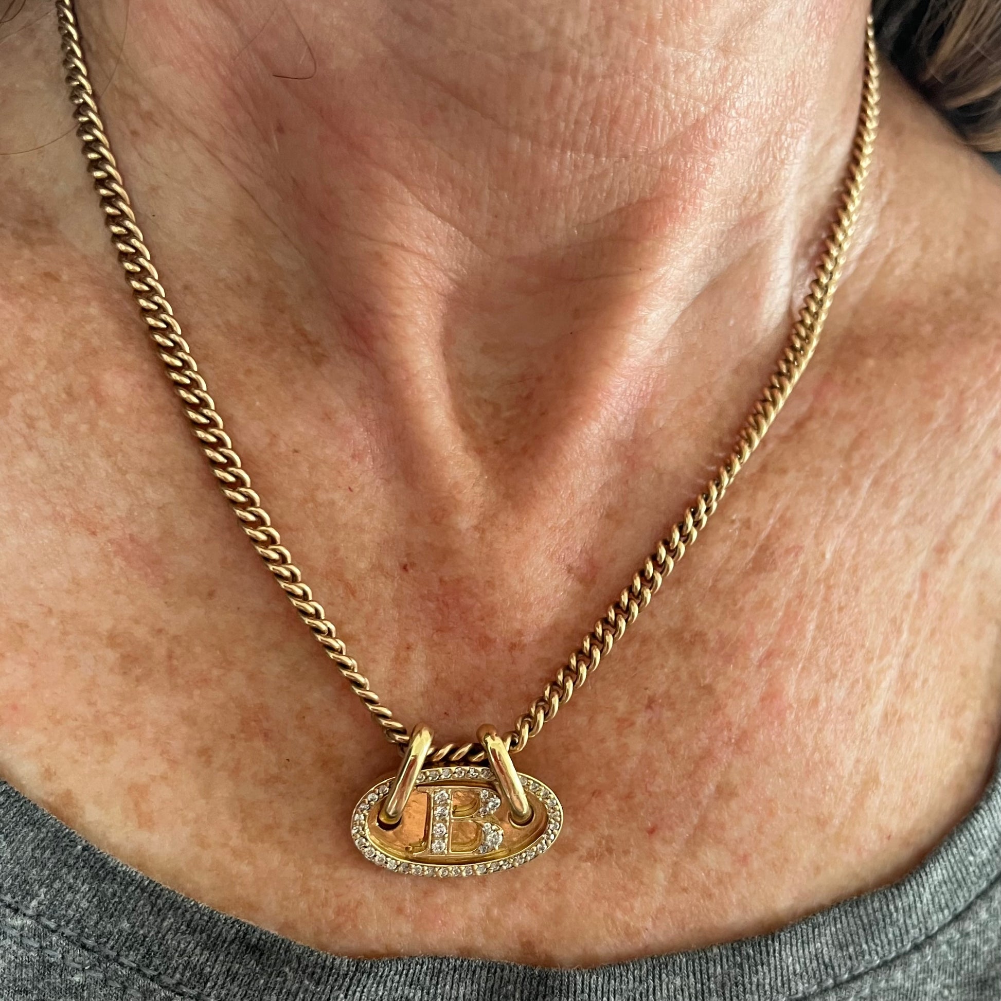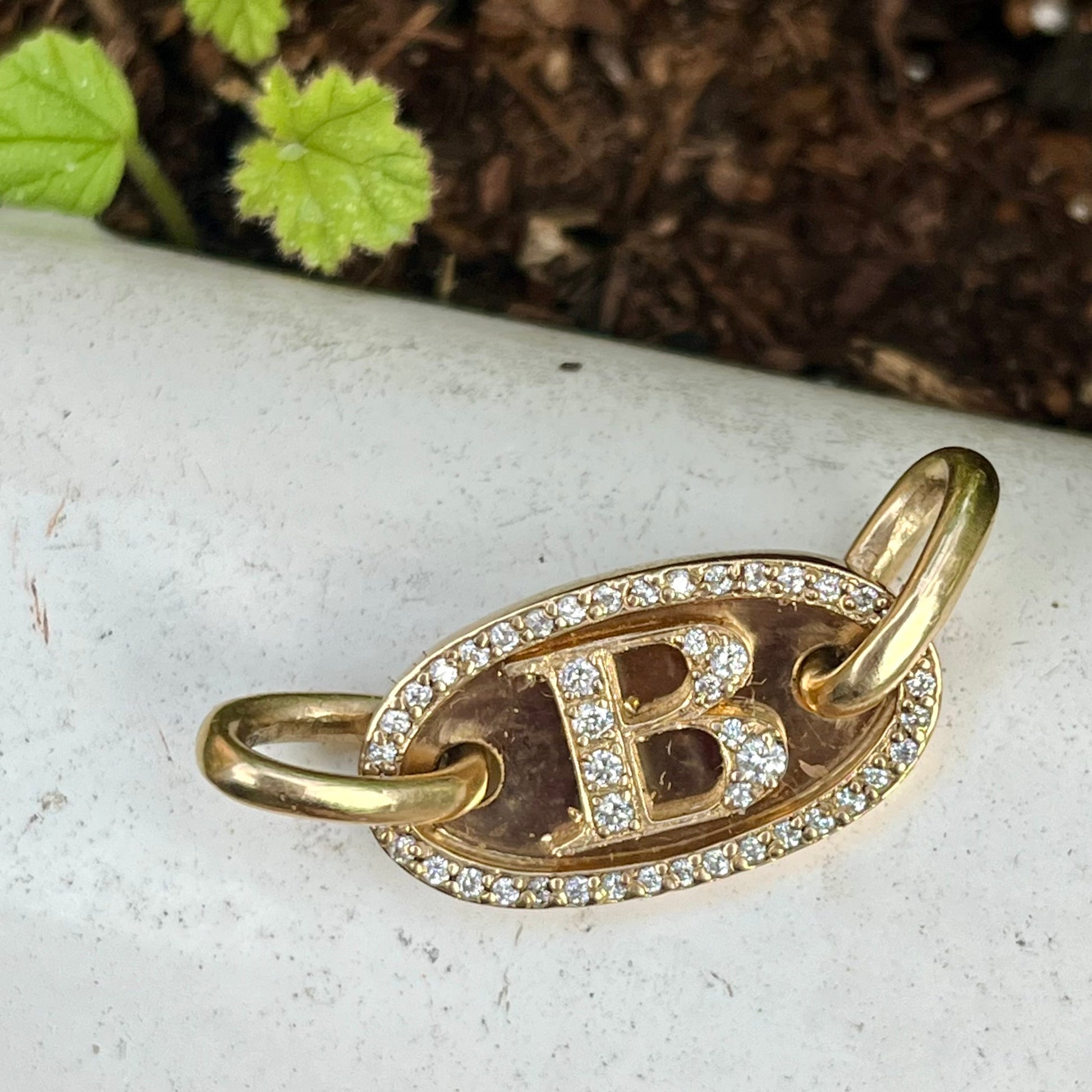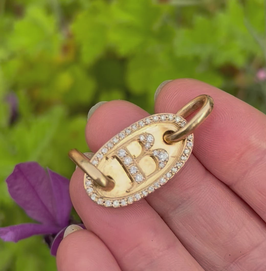 Hand made, beautifully crafted solid custom letter plate made to order, with your letter of choice! See font options in photos. 18k yellow gold and set with .50+ ct brilliant cut diamonds. Add to a chain, to connectors, to a bracelet. 9.7g, 18k, plate is 1" long x 1.5" high. Thick oval rings have a 5mm wide opening and are approx 8mm long.