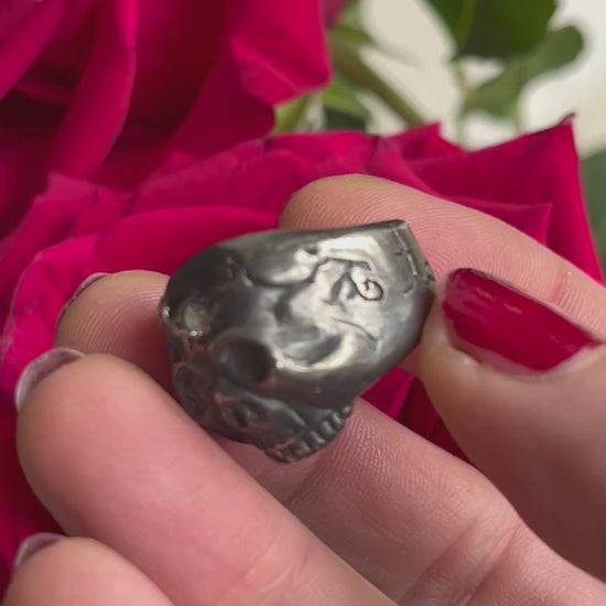Our obsession with skull rings continues, oxidized sterling silver with about a half carat of bright, brilliant cut natural diamonds flush set across the forehead, and a little diamond tooth. It is hand etched around the shank: "to the death." Love to the death, fight to the death, dream to the death. I19.8mm high on the face tapering to 8.8mm around the back. Low, comfy profile. size 7, it's nice and heavy at 19g.
