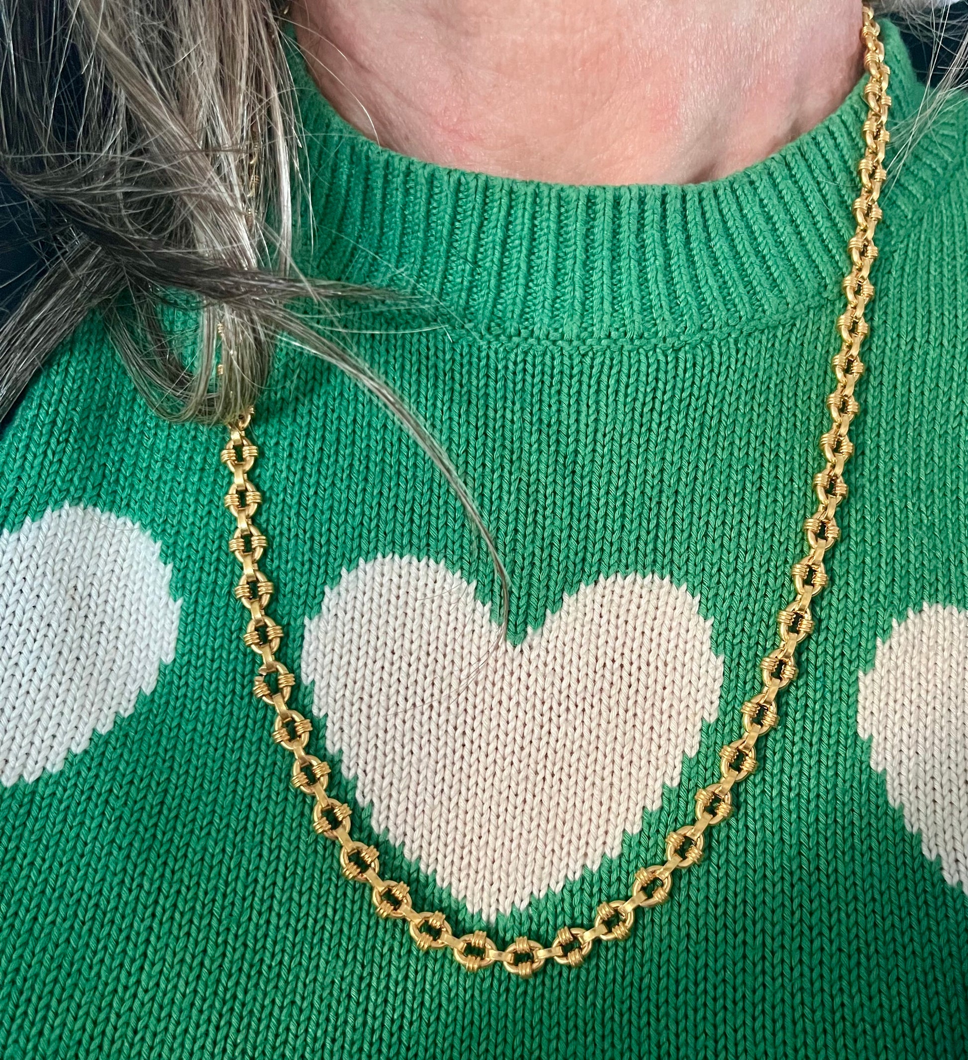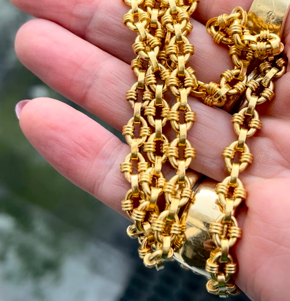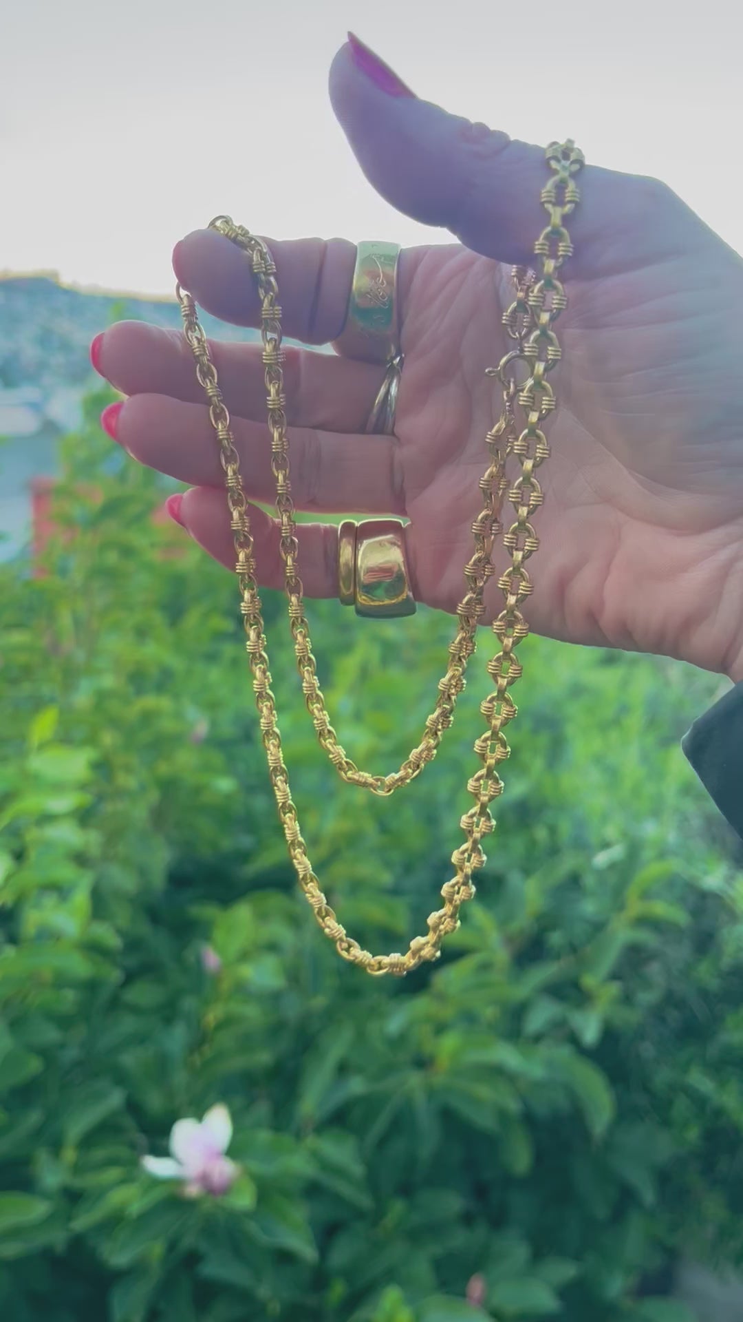Heavy, handmade 18k chain- a fancy mariner link, hallmarked and in excellent condition. A buttery and solid 62+g. 24" long, about 5-6mm wide. French eagles head punch mark on the end of the chain; an unusual link that plays well with others and has great presence solo or with a ginormous pendant. Clasp is not quite the same color but I have been told it's original. No matter, the chain will melt your heart!