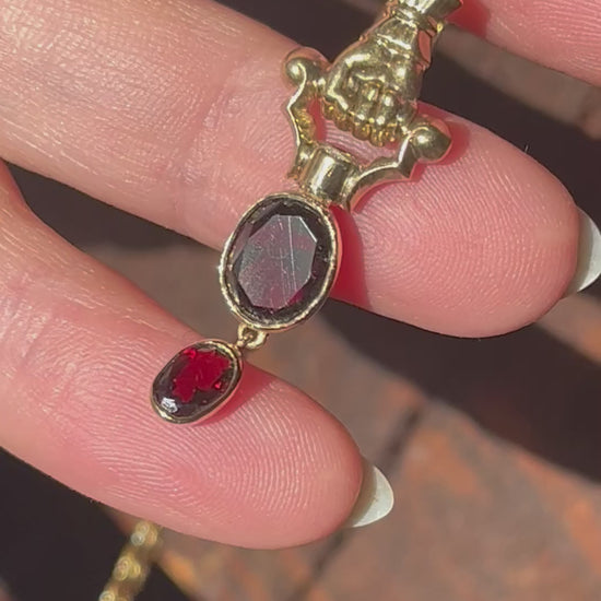 A helping hand. A 10k gold antique component with a 14k bail and newly set garnets in 14k bezels. An instant classic with the qualities of a trembleuse... 38 mm long, 3.9g.