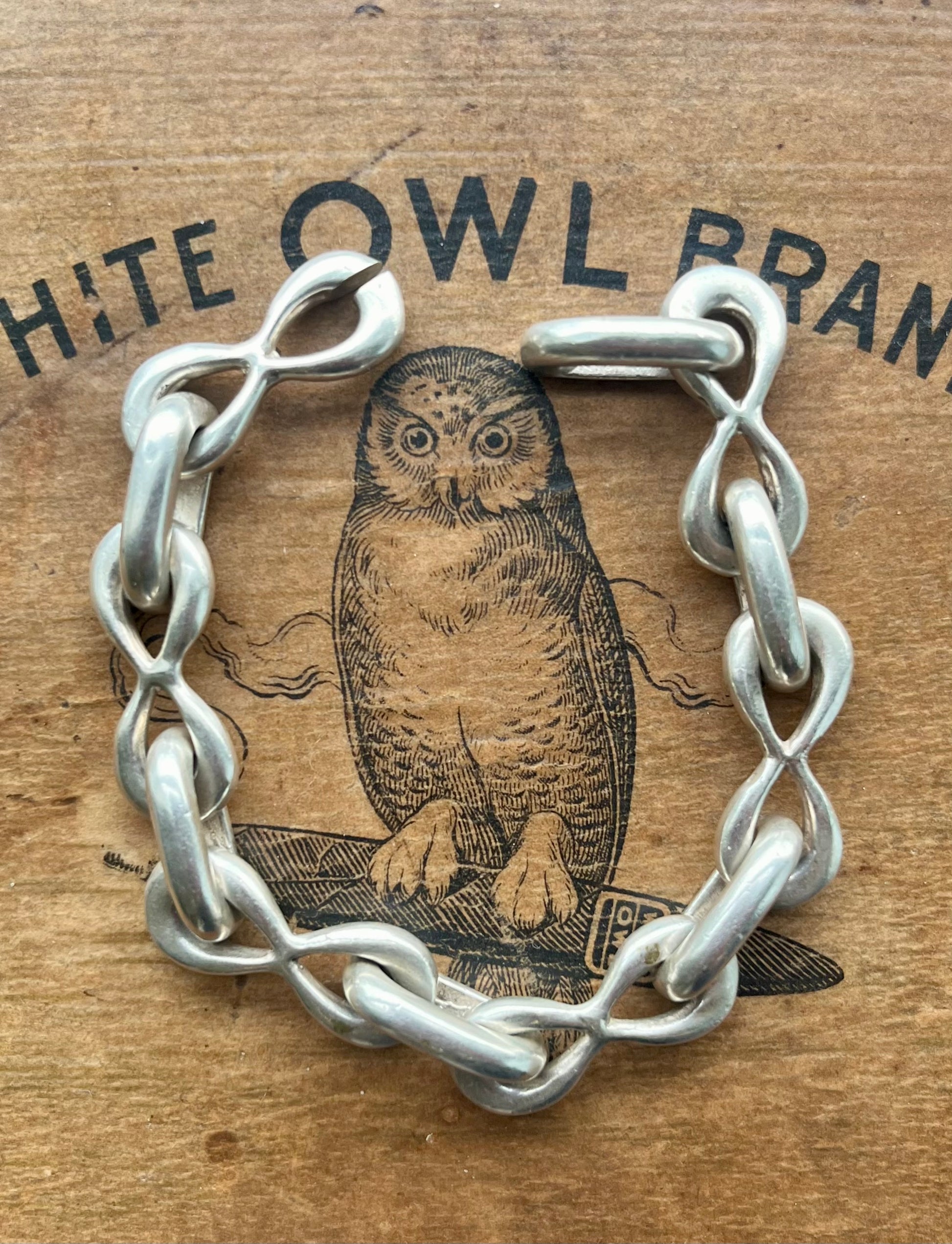 This is perhaps an unintentional version, with infinity links and a very clever clasp that is indeed challenging to put on. When it's on, it's on, a beautiful design, and such a nice weight. Very soft , feels nice on the wrist.