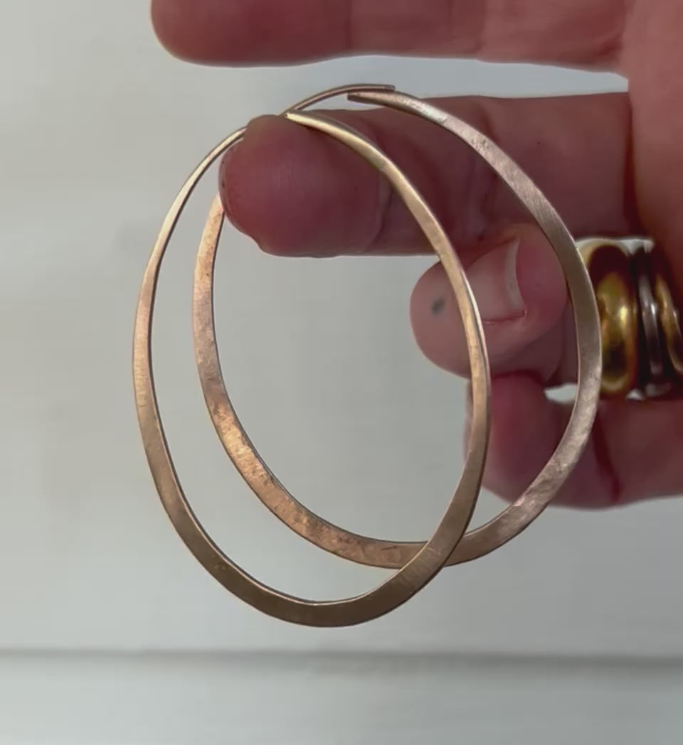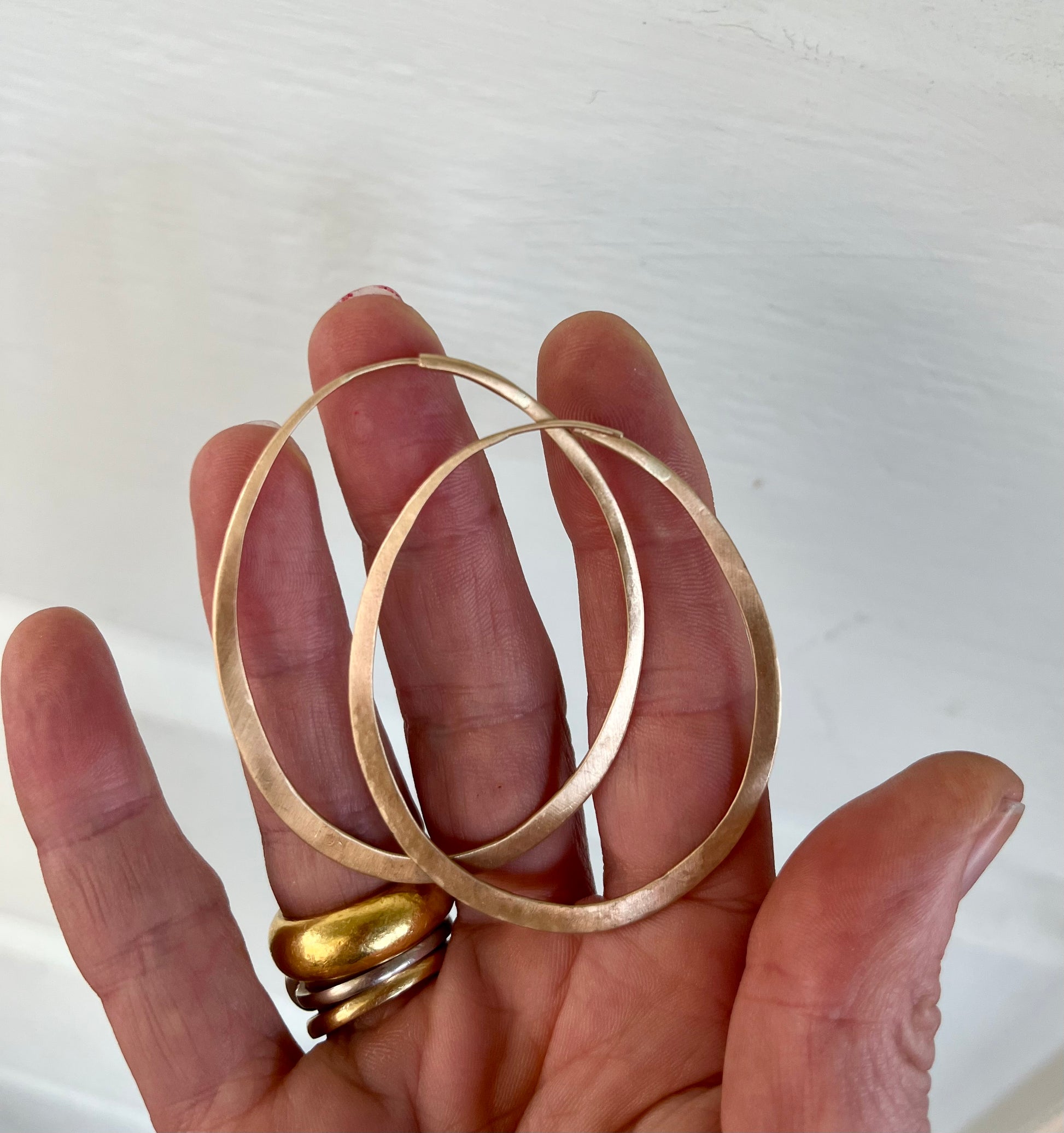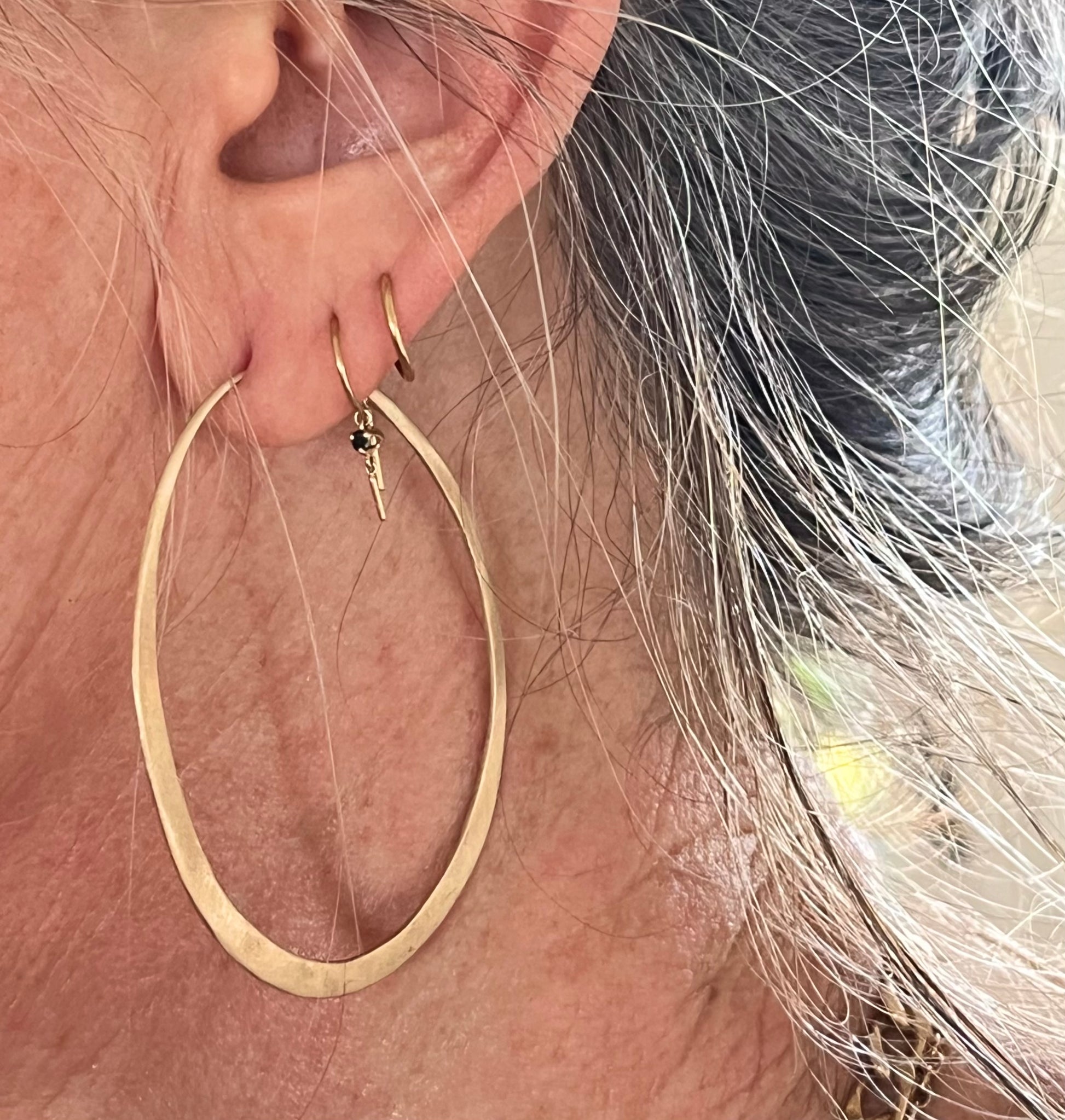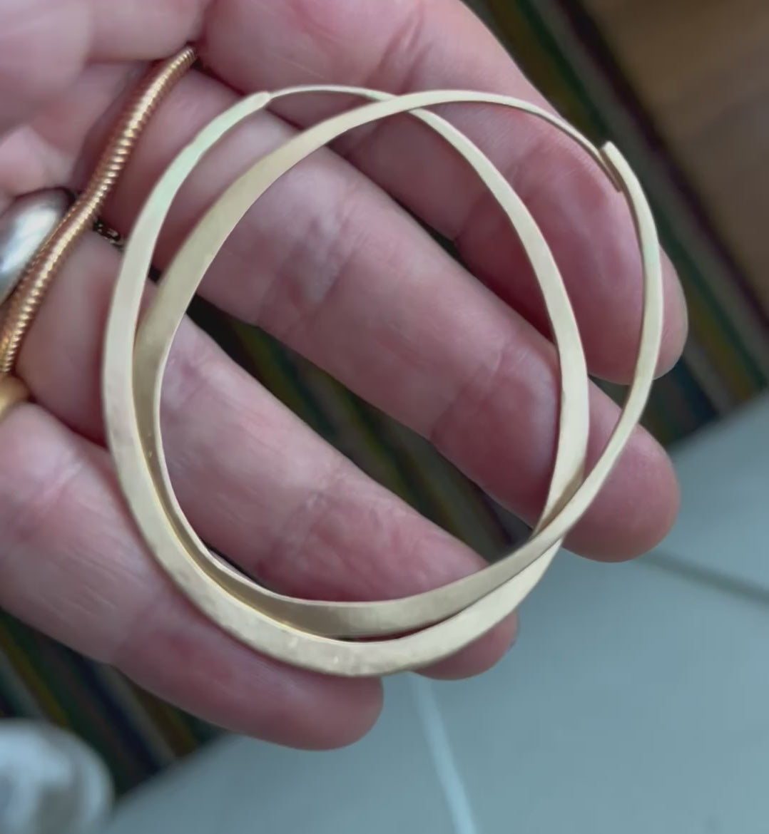 #igdcustom . The post inserts into the other end of the hoop. The base of the "egg" is flattened. The color is a warm 14k. They are +-7g together, solid except for the back there the post goes, and about 55mm long and 47mm at the widest point.
