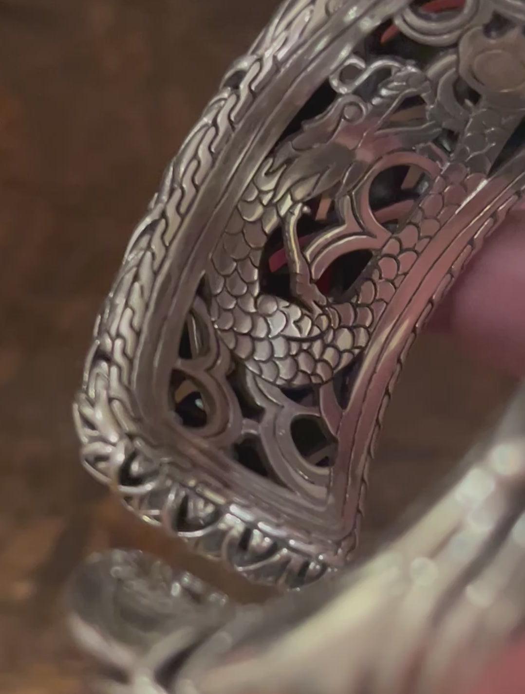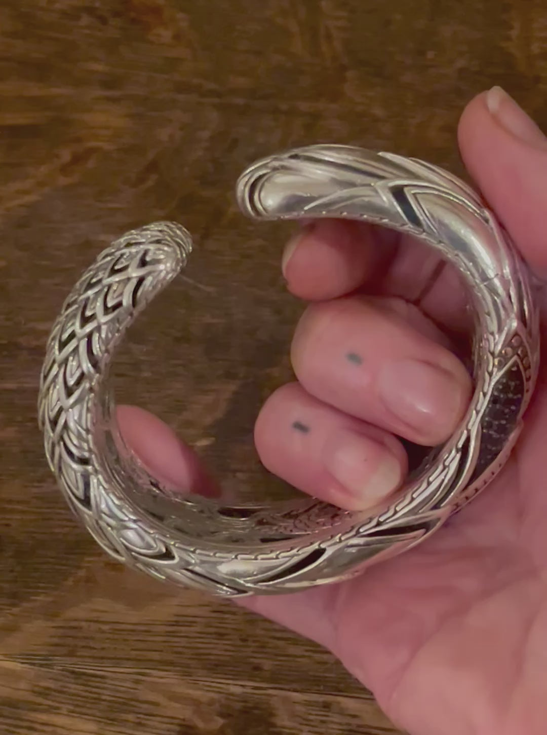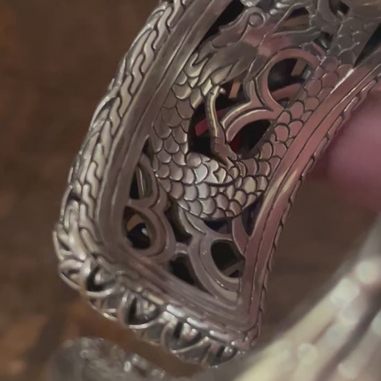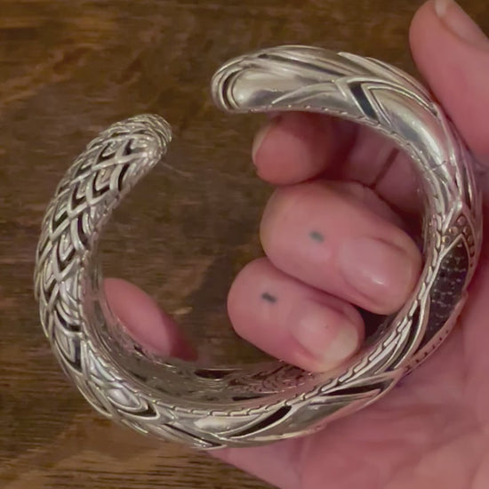 A statement cuff, with all the fantastical detail expected from John Hardy, wild and beautiful engraving and design throughout the interior and a scale motif that is crisp and clean and gorgeous.