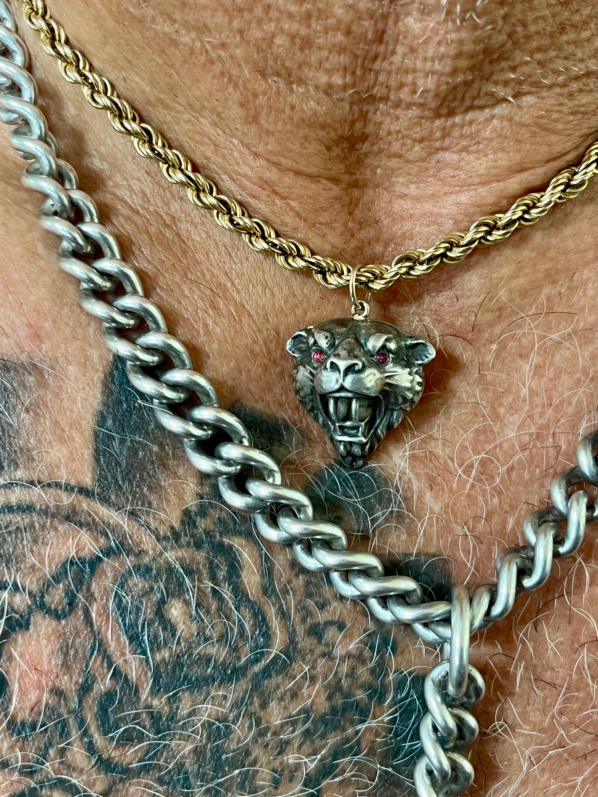 Sterling silver, signed, antique Unger Brothers roaring Lioness pendant with ruby cabochon eyes. Converted by us from a stickpin, semi hollow and really well constructed. Beautiful patina- 6.5g, 29x 22mm inclusive of the added 14k gold bail.