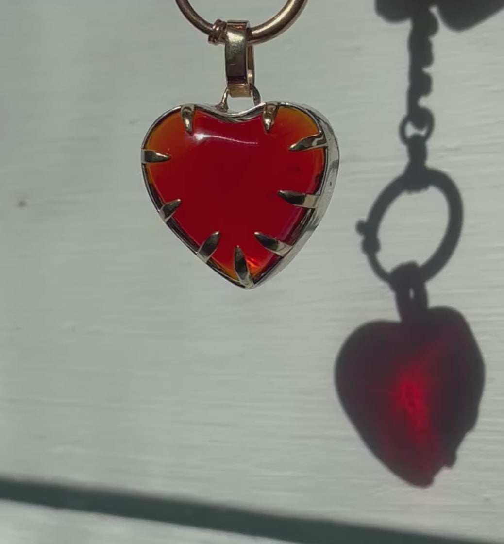 A simple glass heart with bubbles and idiosyncrasies, bezel set in silver and framed with 18k bail and claws, because hearts should be held, protected and exposed all at once.