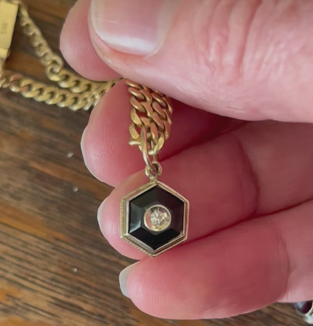 Onyx and diamond stickpin conversion, set in 14k, about 20mm high w the bail.