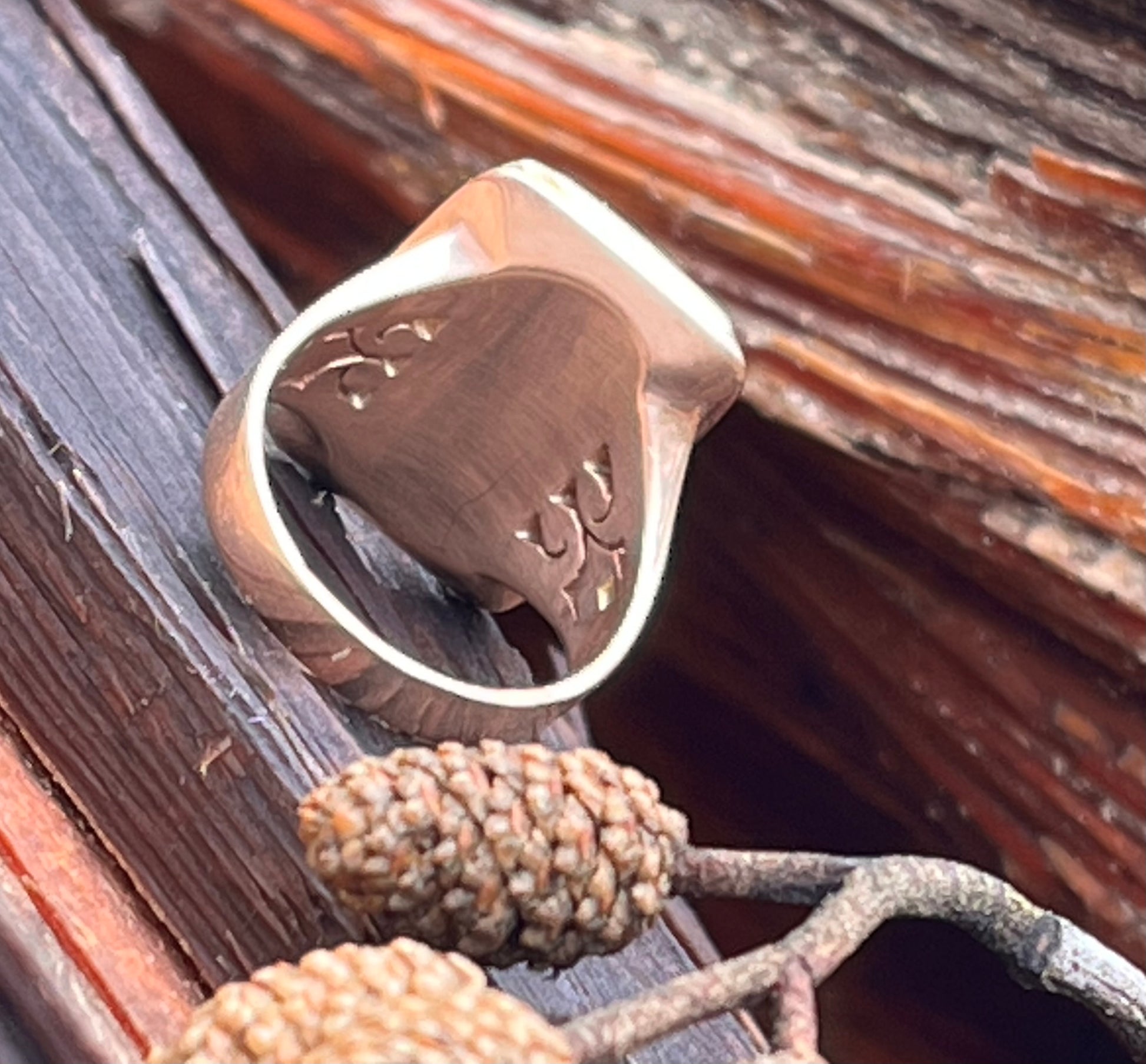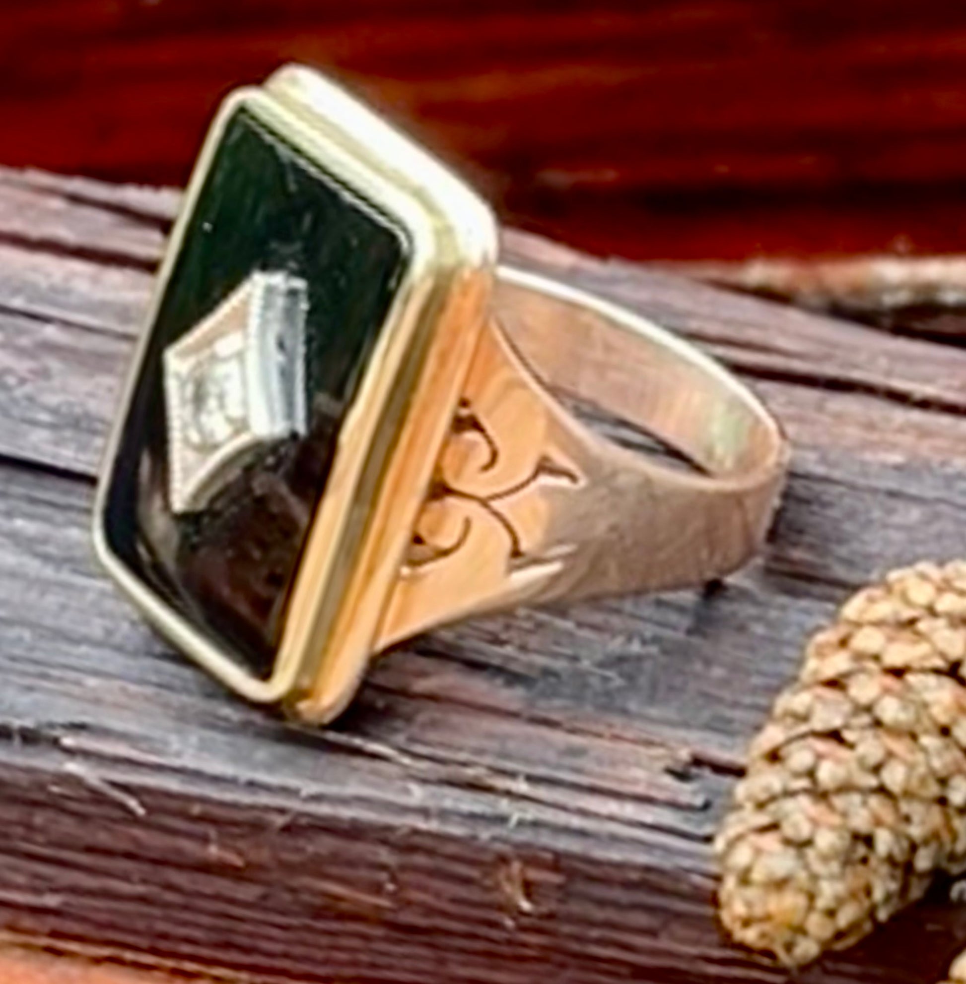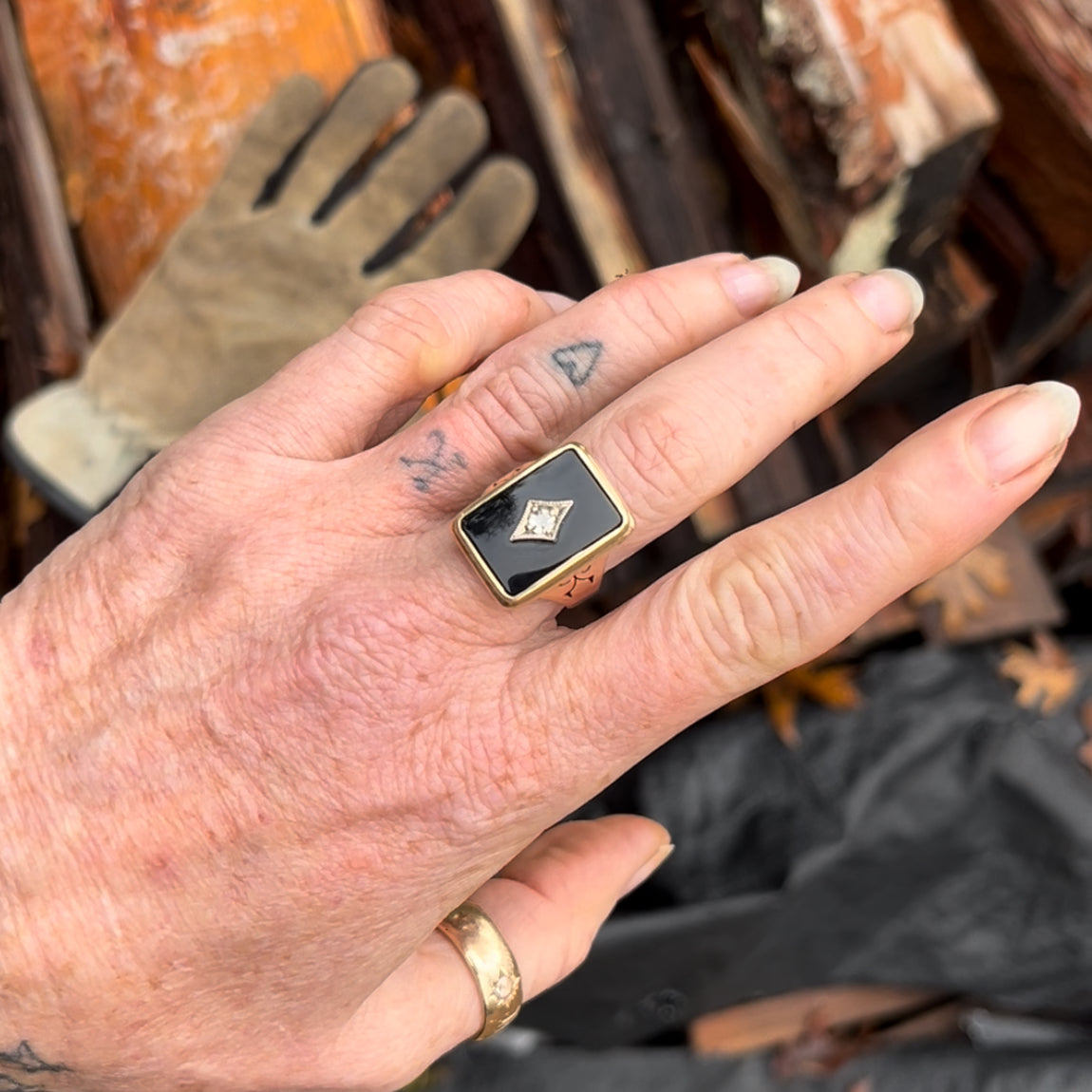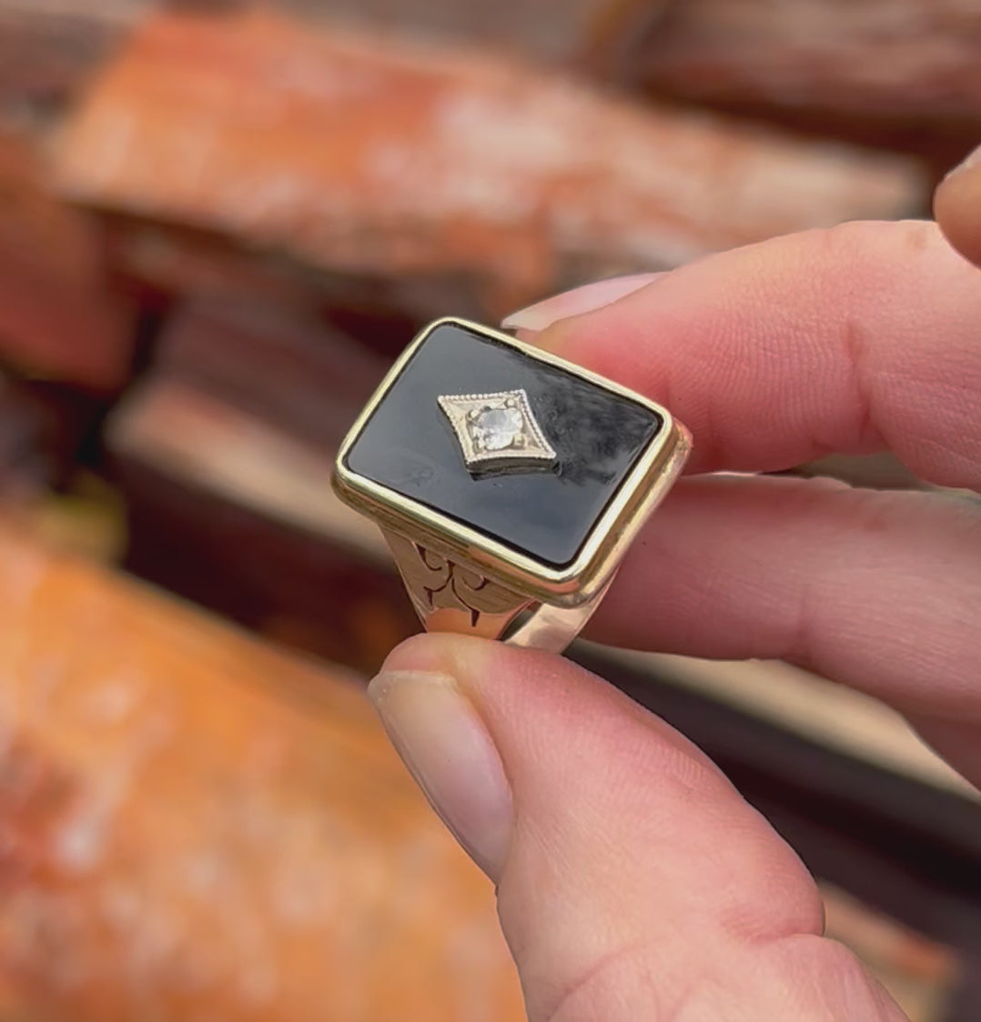 Handsome, sturdy and classic antique onyx ring, set with an OMC diamond in rosey 14k and 8+g. The face is a substantial 18 x 12mm and the undergallery and shoulders are *chef's kiss.* Size 7 and sizable.