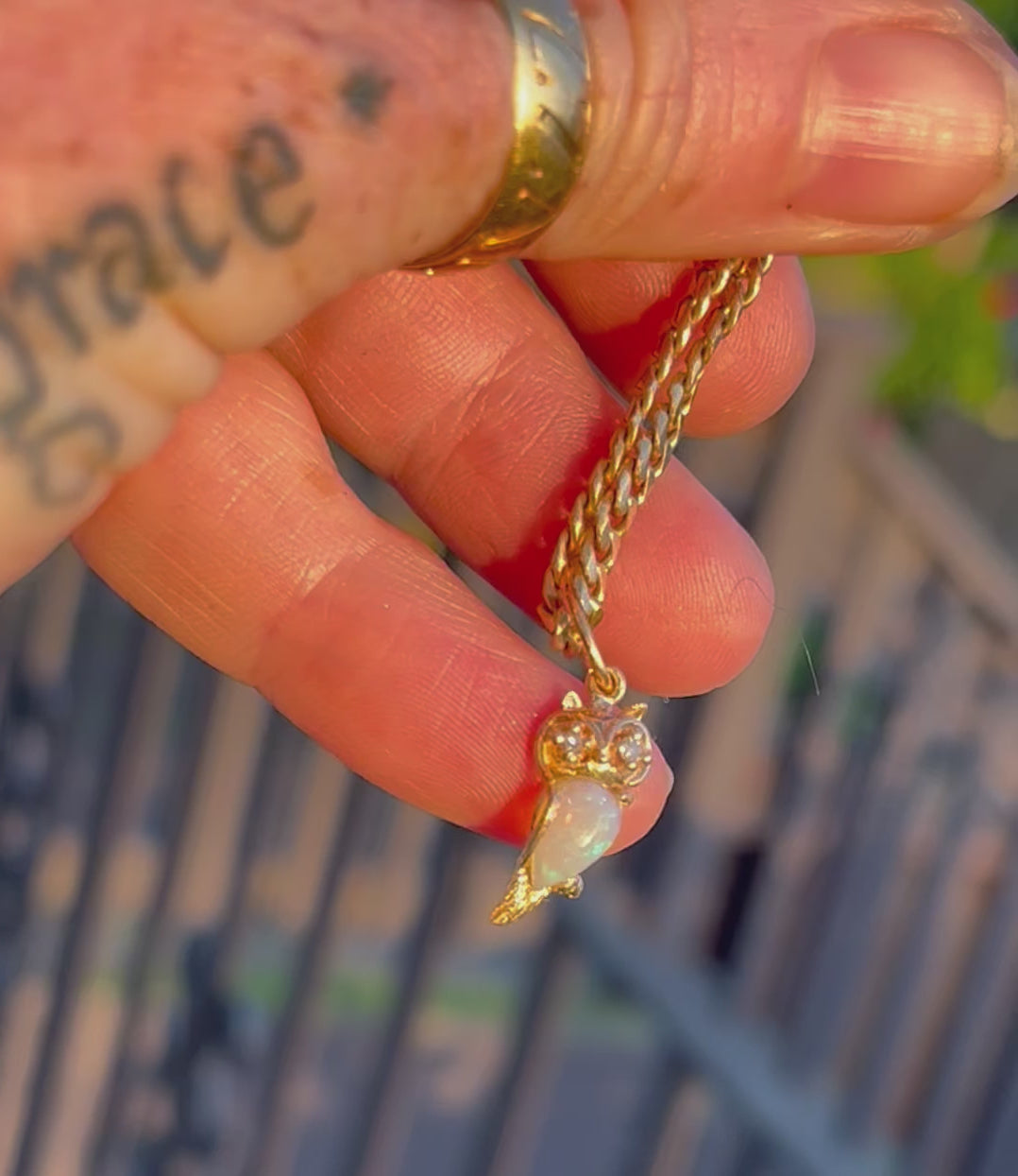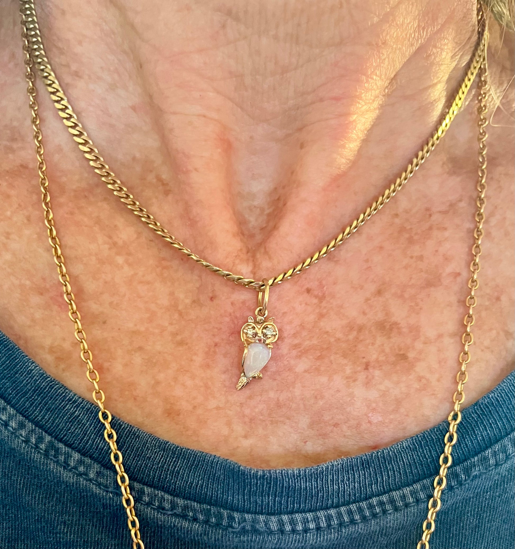 Vintage owl stickpin conversion charm, 14k w an opal belly and diamond eyes. 17mm high w a nice big 5mm bail.