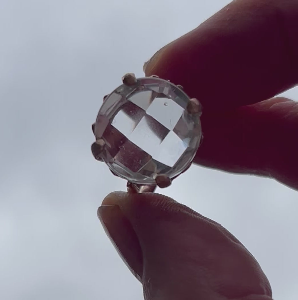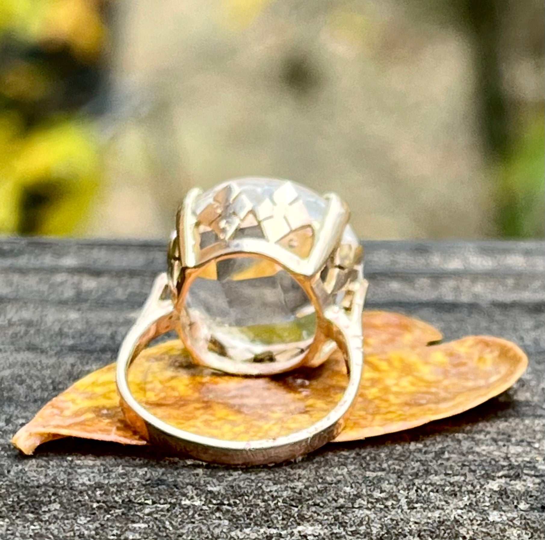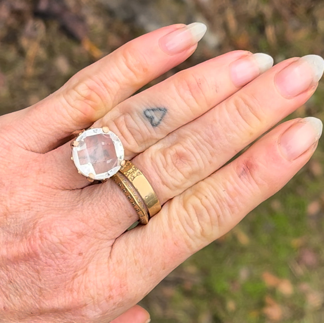 The view through a faceted rock crystal is magic, especially if you have a tattoo on your finger :-). Antique cocktail ring with a faceted rock crystal set in 14k. .size 4.75 and sizable.