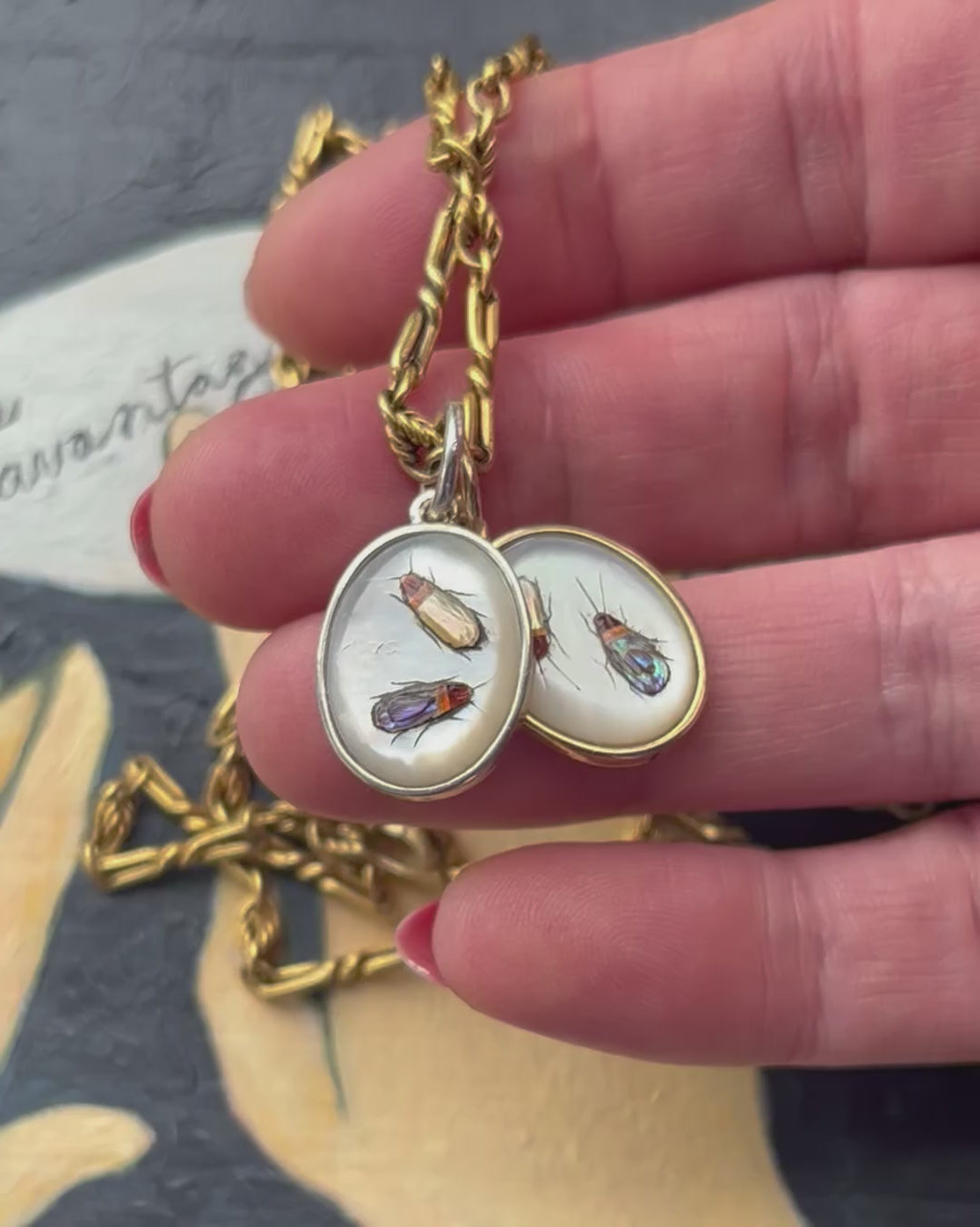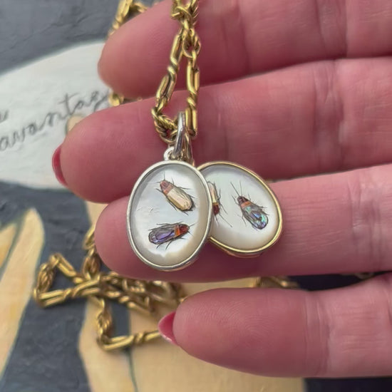 Vintage Japanese Shibayama charms: bugs on mother of pearl ovals, converted from cufflinks. This listing is for the silver one.