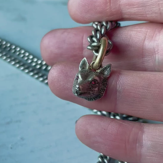 Sterling silver antique stick pin conversion fox, set with ruby cabochon eyes. We added a nice big fat 14 K bail which has a 7mm inner long- way diameter and is over 2mm thick. The whole piece is 22mm long.