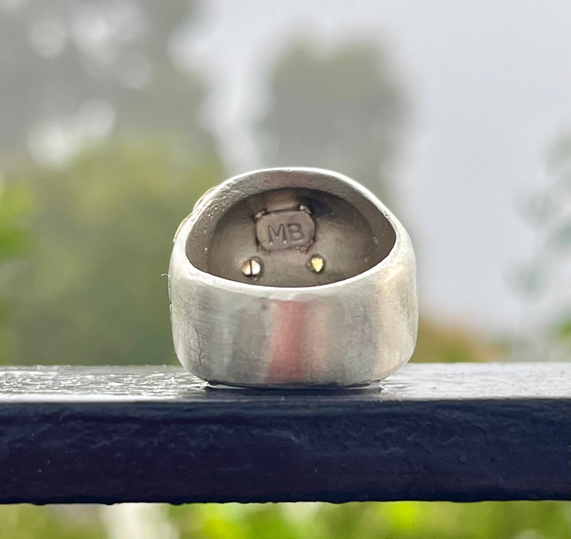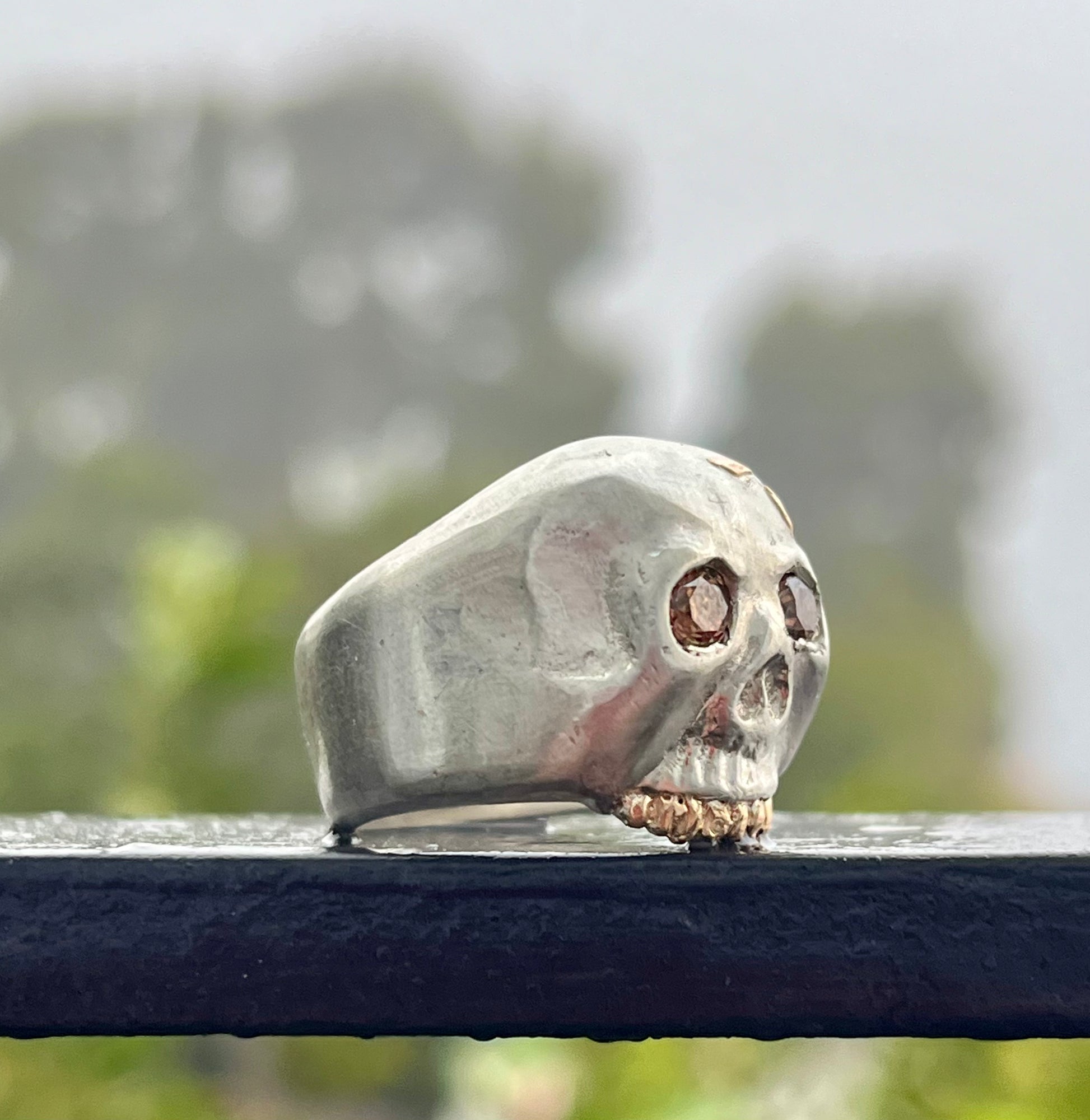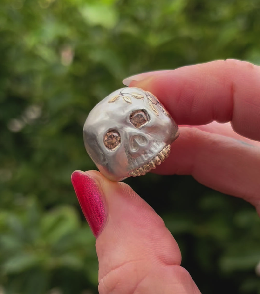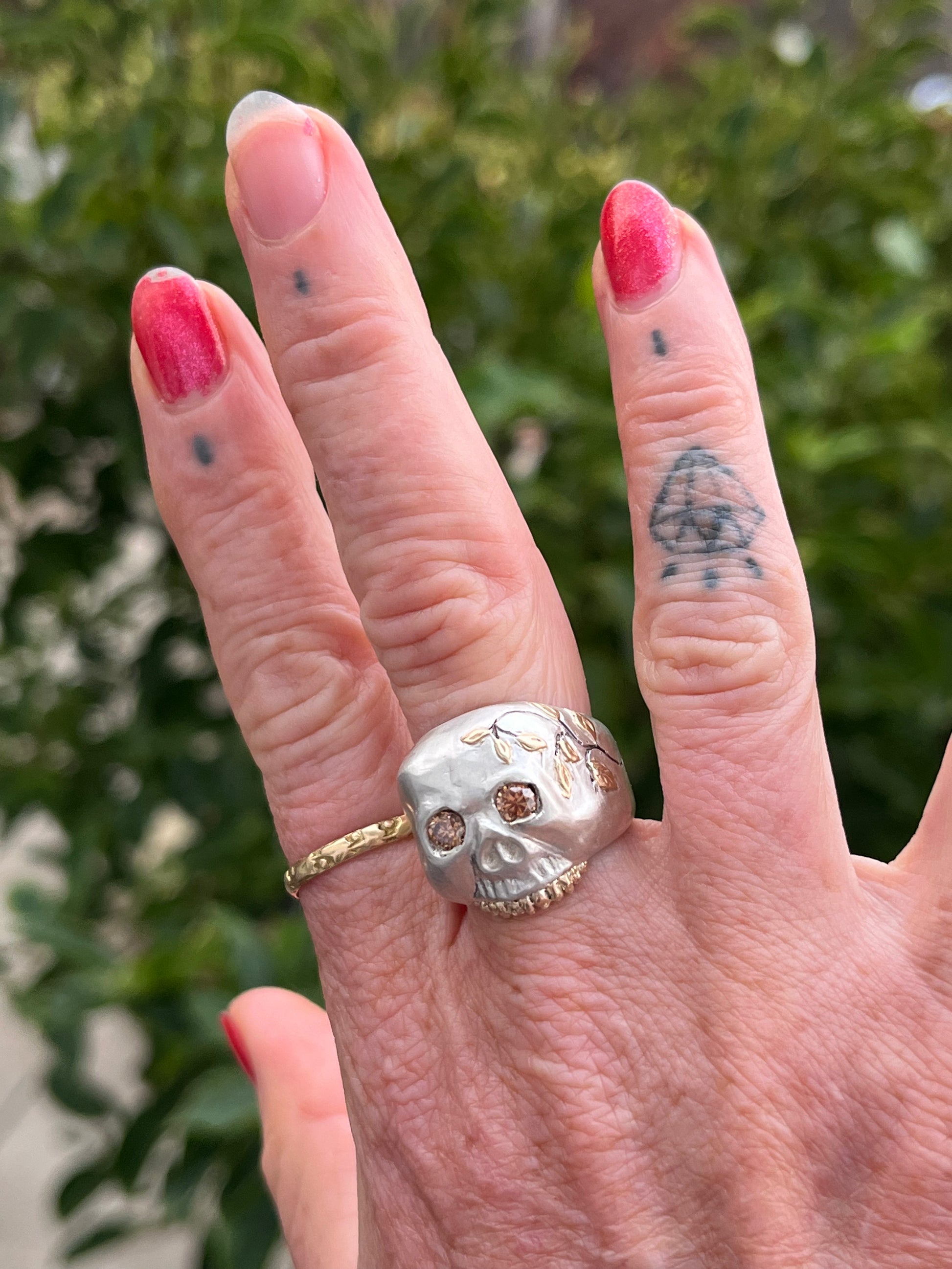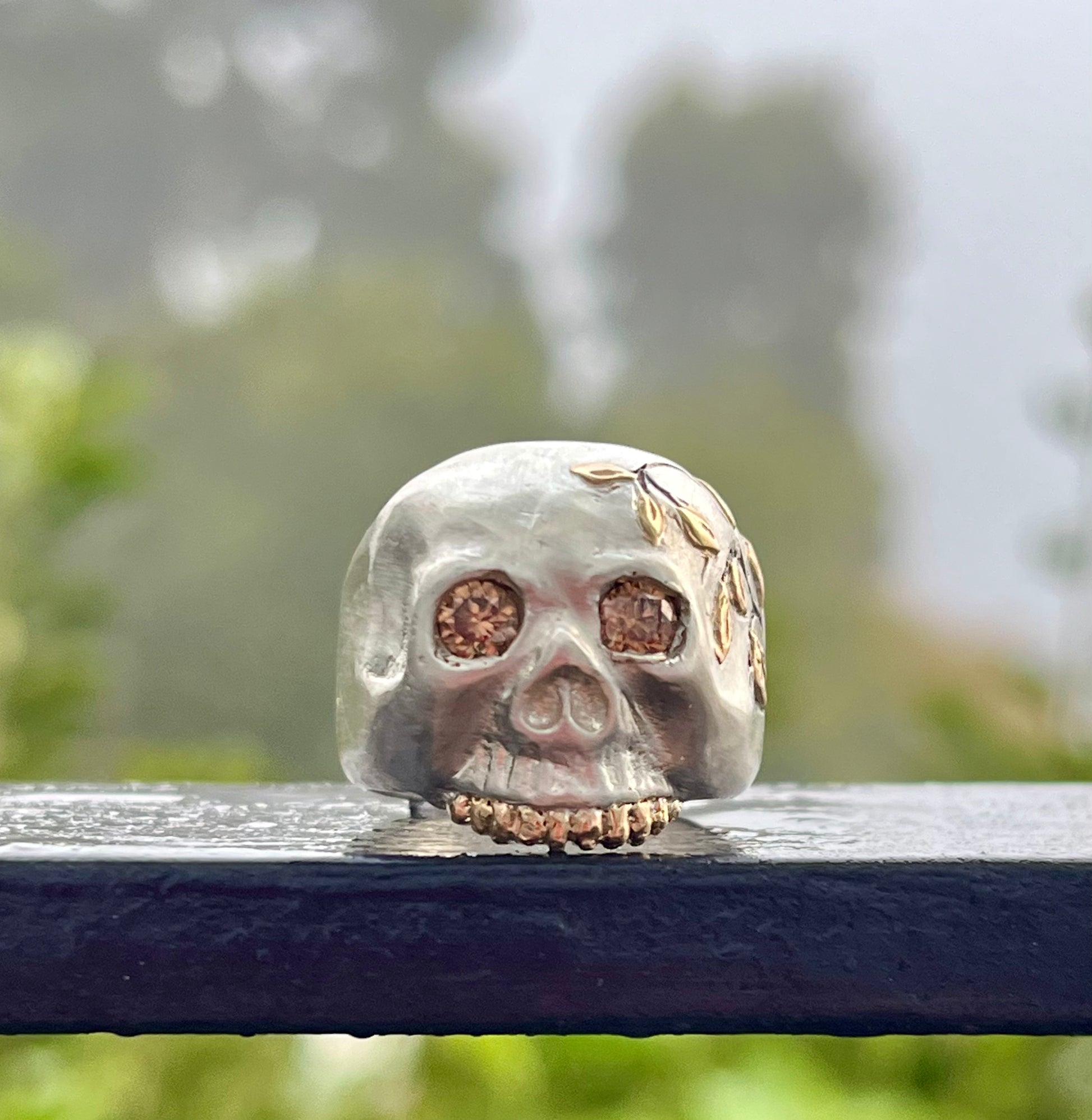 Sterling silver skull with 14k gold leaves on an engraved vine, gold teeth, and champagne diamond eyes, each approx. .40ctw. Solid and just shy of 20g. sizable size 7 and positively one of a kind. A piece like this is made to order, please email for details. Allow 4 weeks to completion.