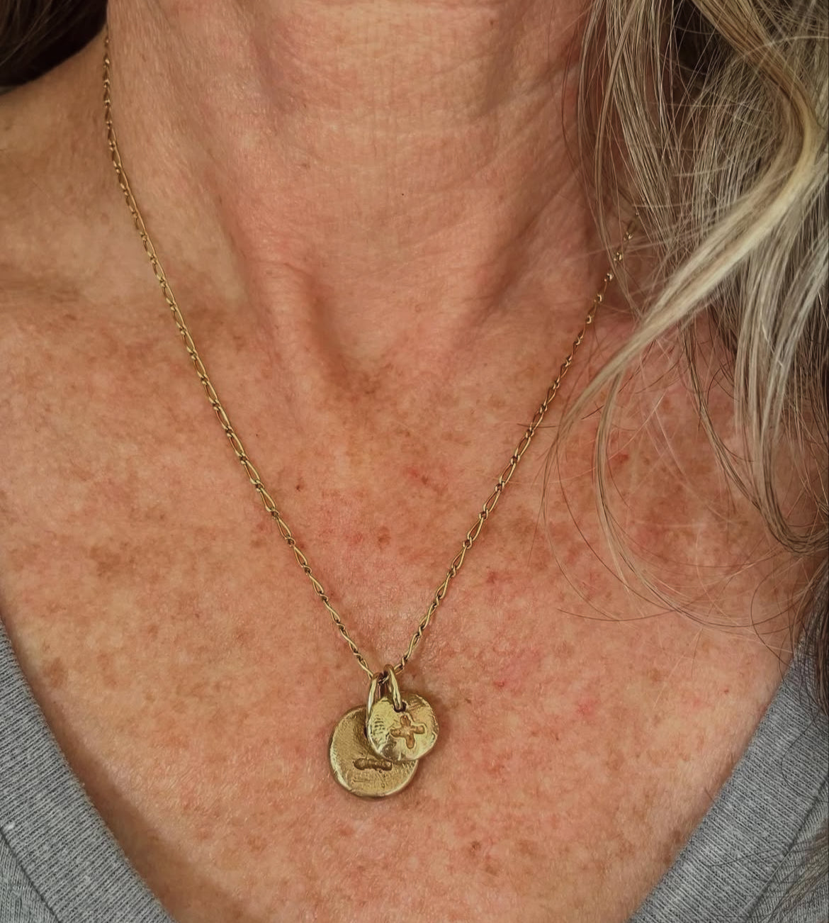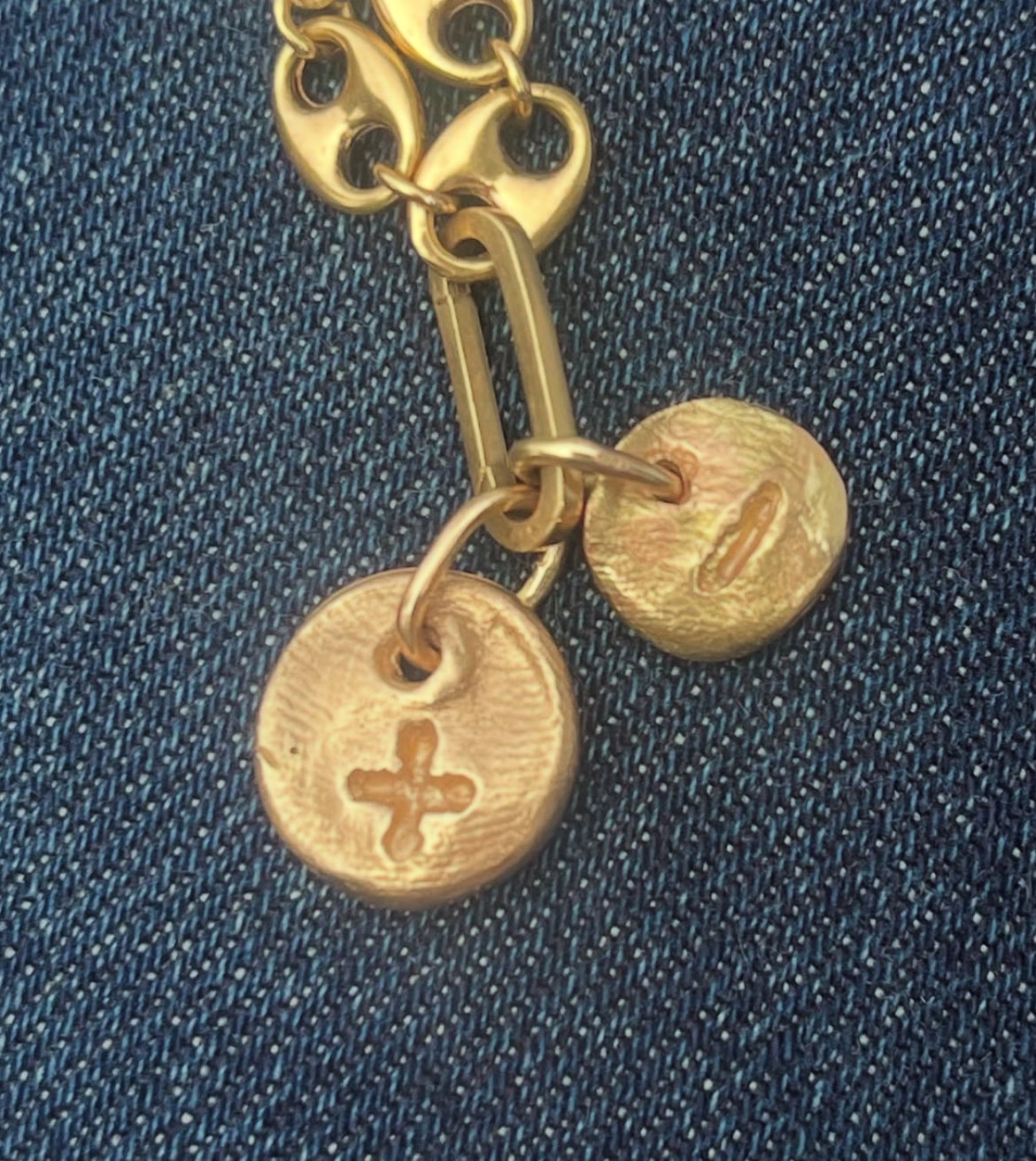 These charms are organic, OOAK rounds made with a thumb (and subsequently a visible thumbprint). Please see the photos and videos for texture and color variations. They are rough and complex and lovely as love, both with the symbolic + and - on either side.