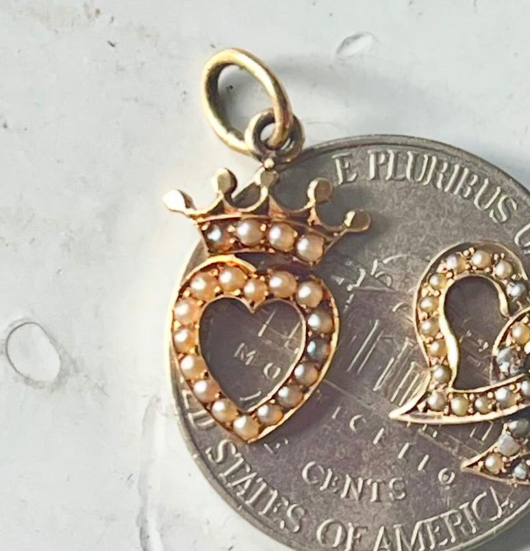 These are sweeties, just such lovely attention to detail. Both 10k and set with natural seed pearls and a 14k bail. This is for the