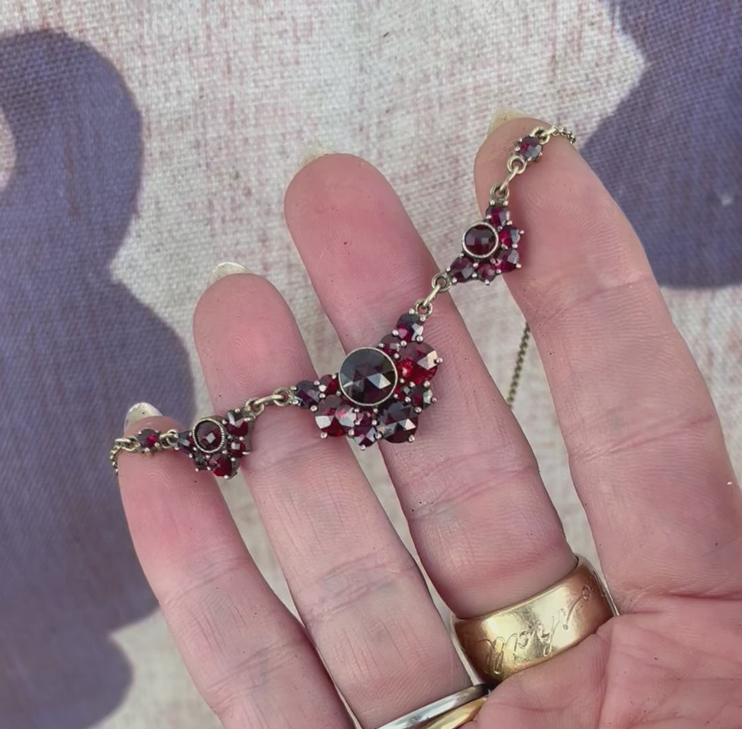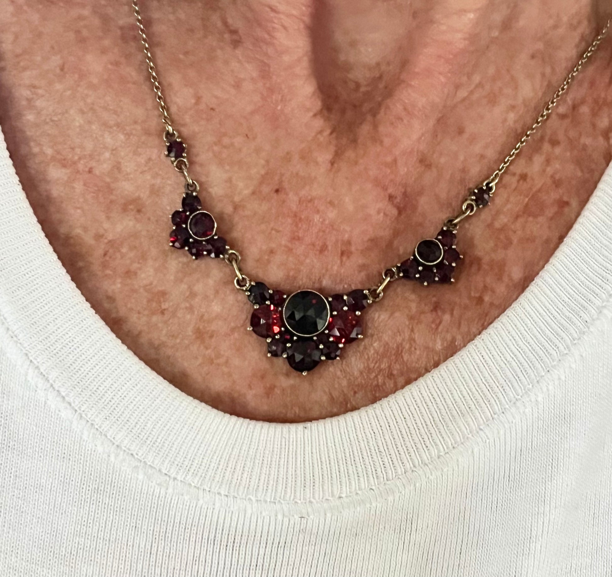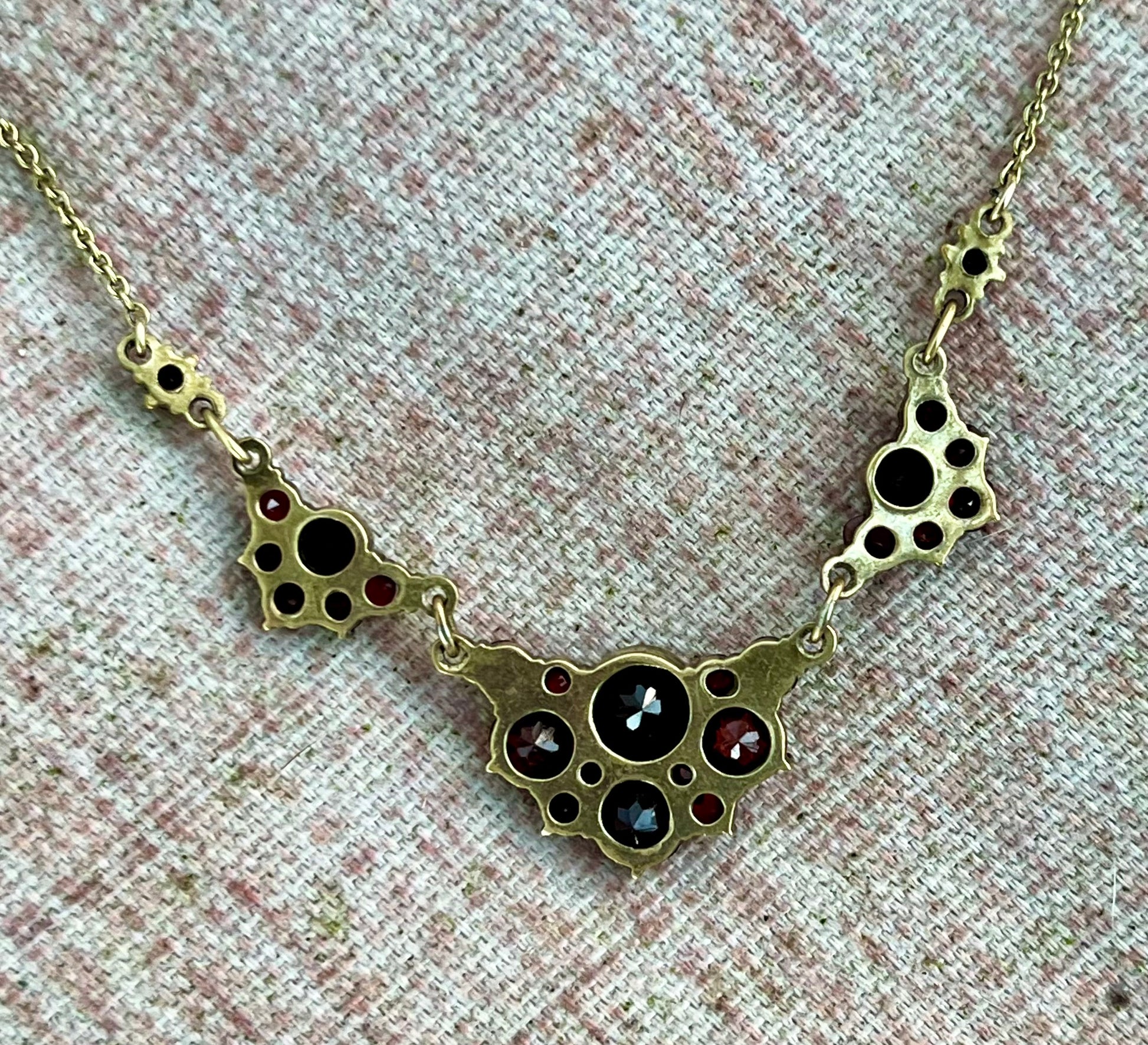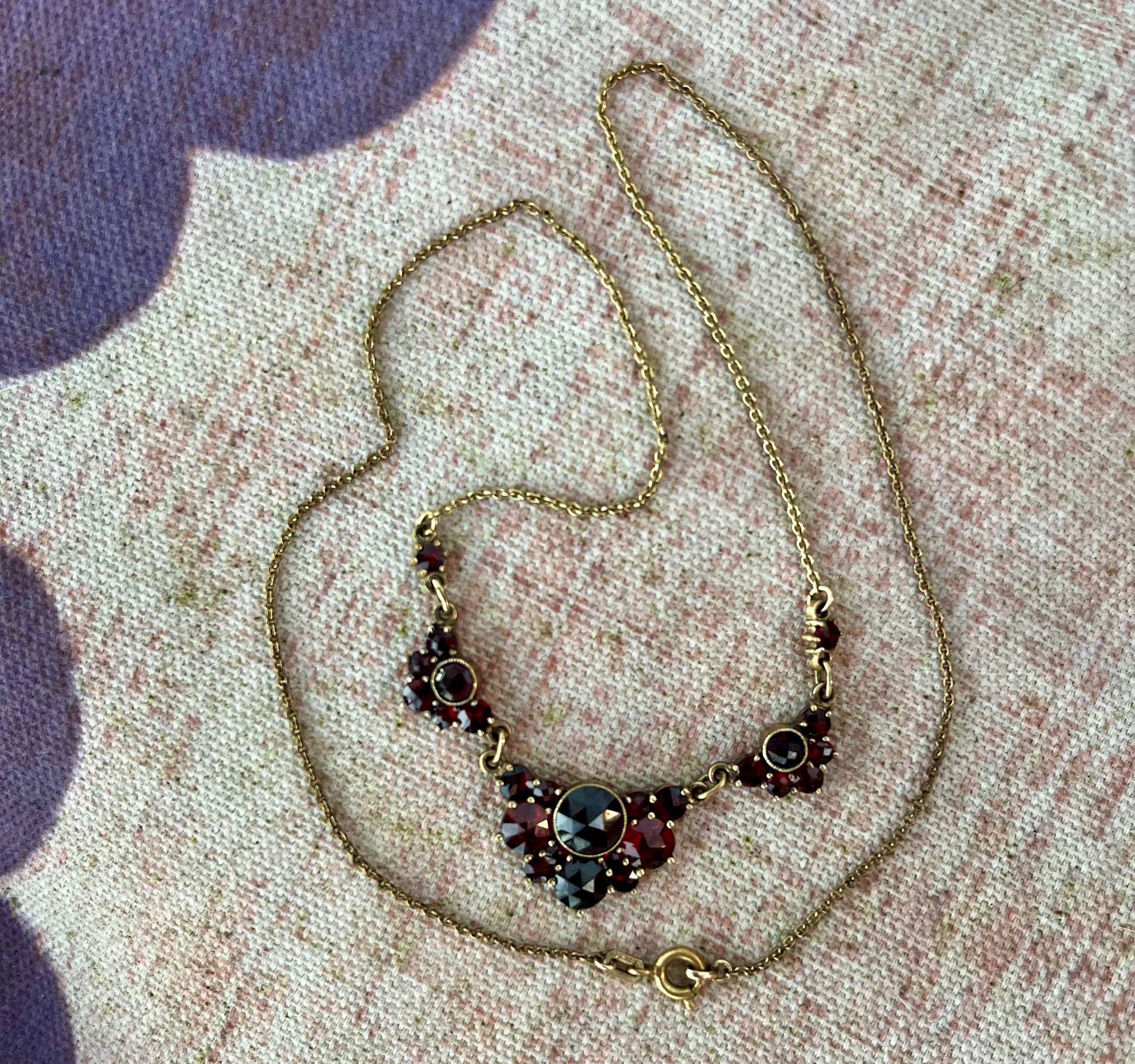 16", such a lovely, intricate design and rich color found in these faceted gems. Gilt or Gold over silver, a perfect little original clasp. Wear a little piece of history...