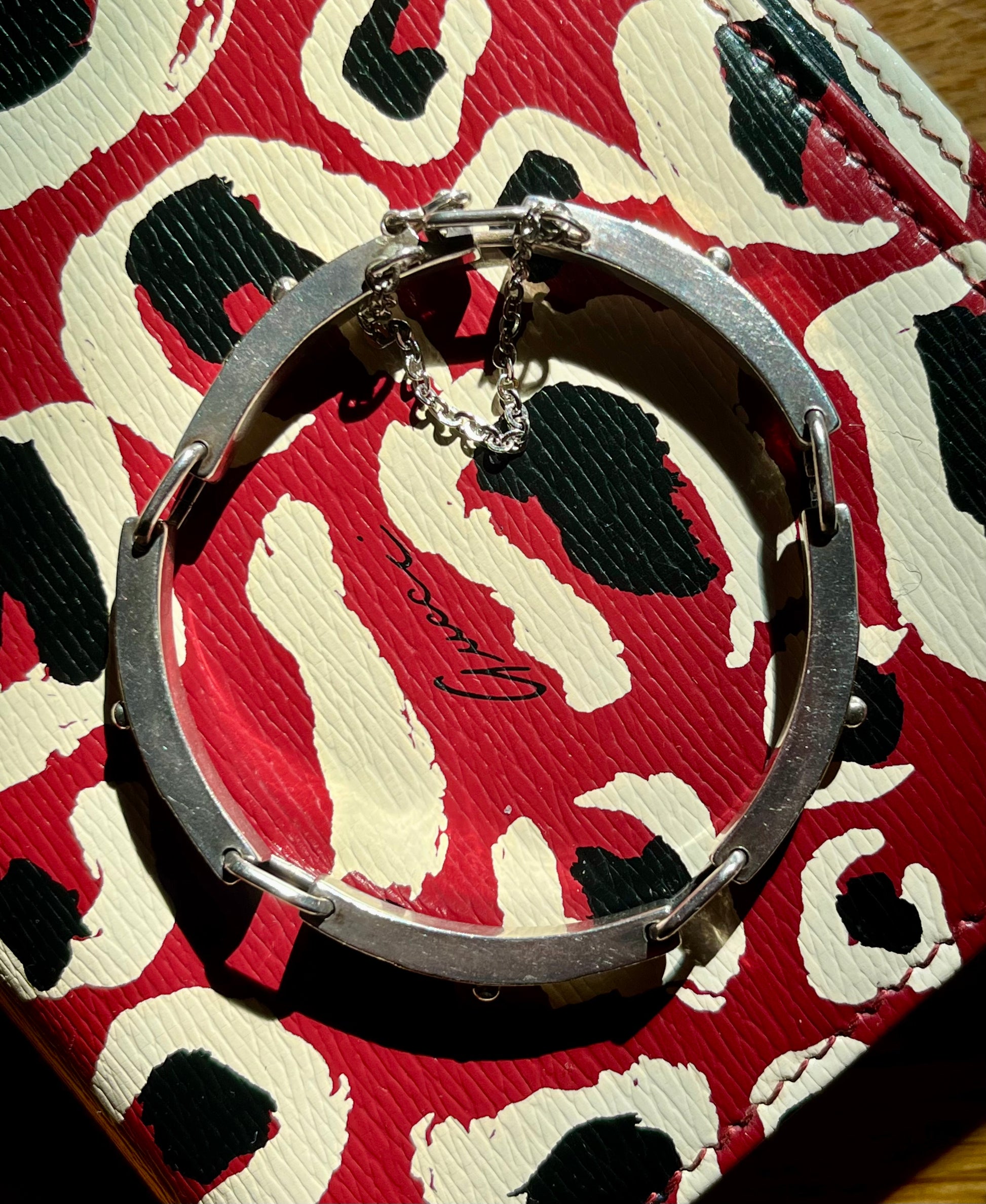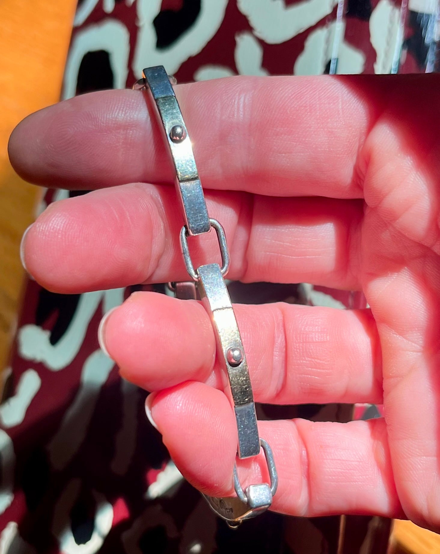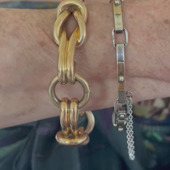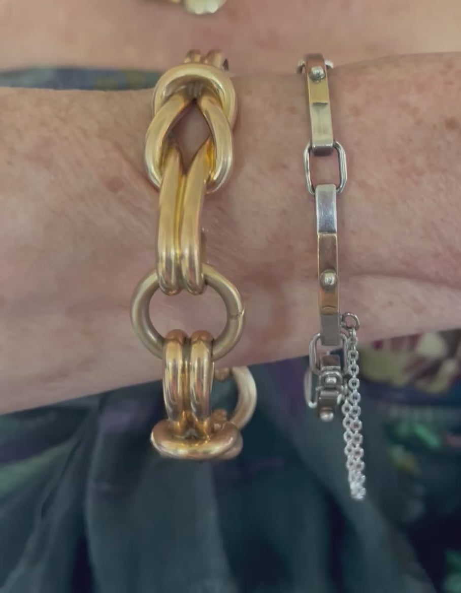 A vintage sterling silver bracelet made in Italy, with panels surfaced with 18 karat gold. Flexible due to the hinged squared off rings, this is a comfortable every day bracelet. Solid, permanent safety chain. Great for a 6 - 6.75" wrist. 29g , panels are just shy of 4 mm wide, rectangular rings are 7 mm wide.